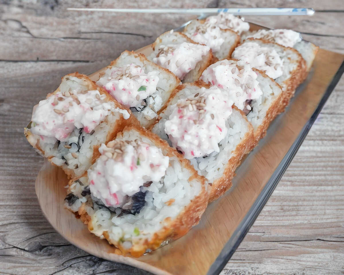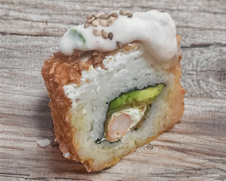 Delicioso rollo relleno de cangrejo empanizado con aguacate y un toque picante de chile toreado; rebosado por fuera con un toque cremoso de chipotle