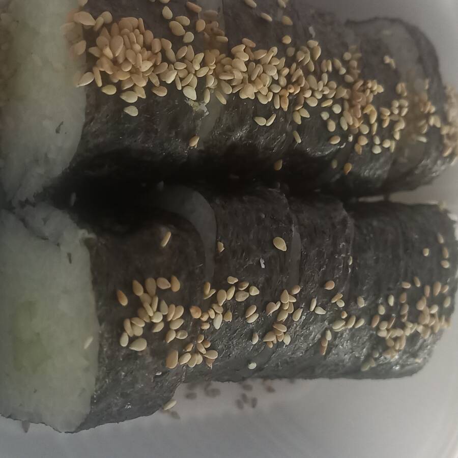 rollo relleno de pepino con alga marina por fuera y un toque de ajonjolí