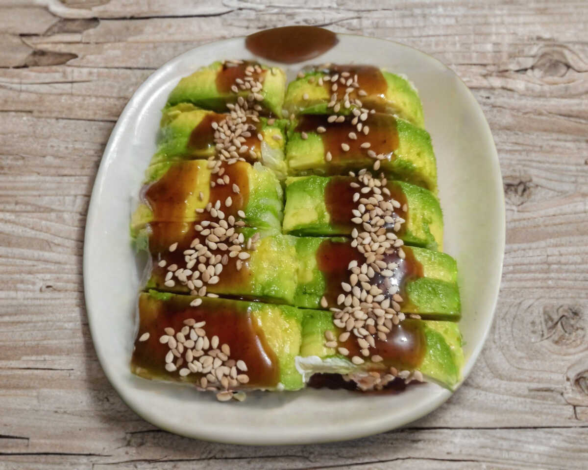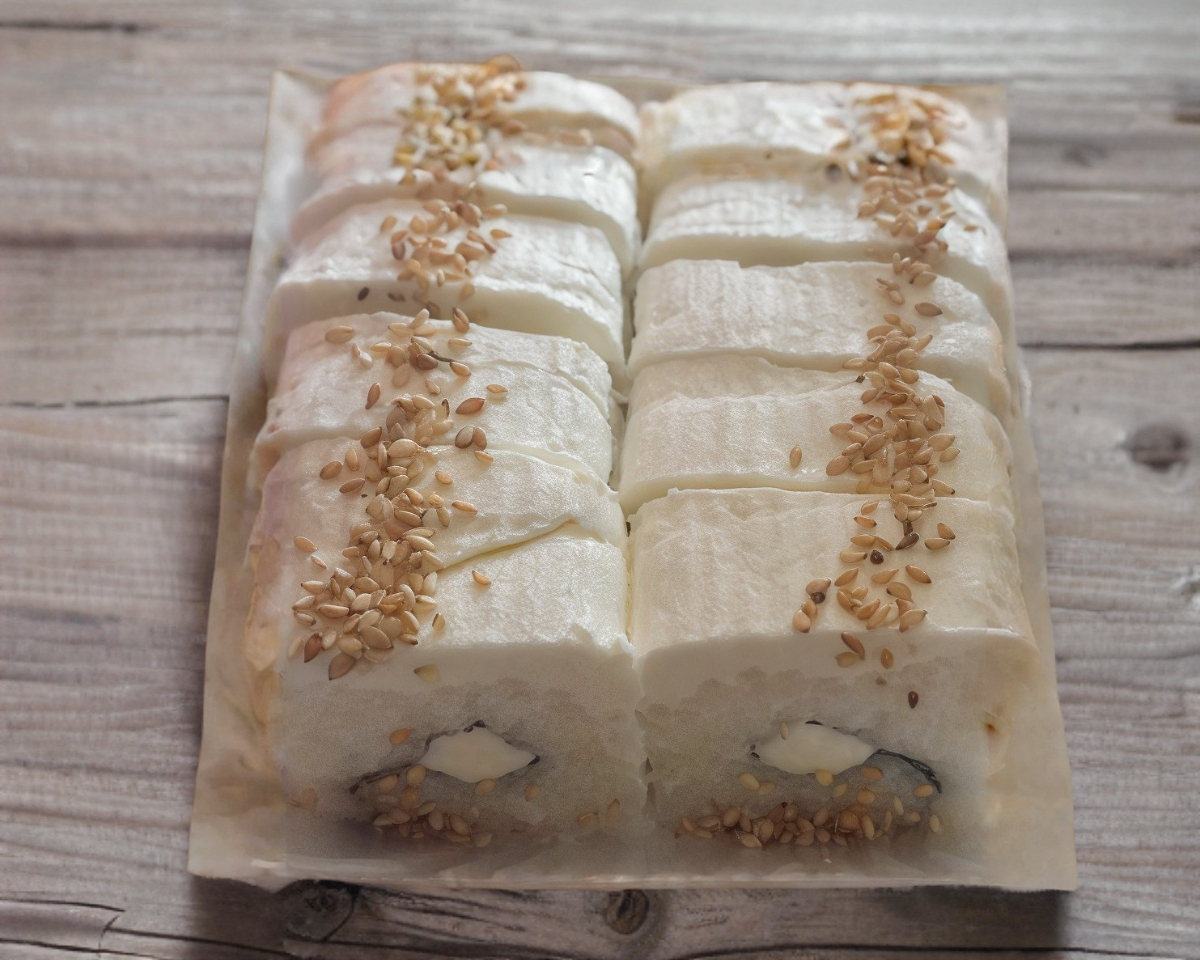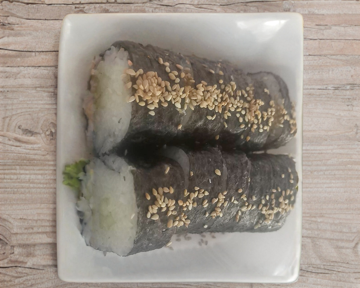 dentro: aguacate, pepino y surimi, fuera: arroz y ajonjolí