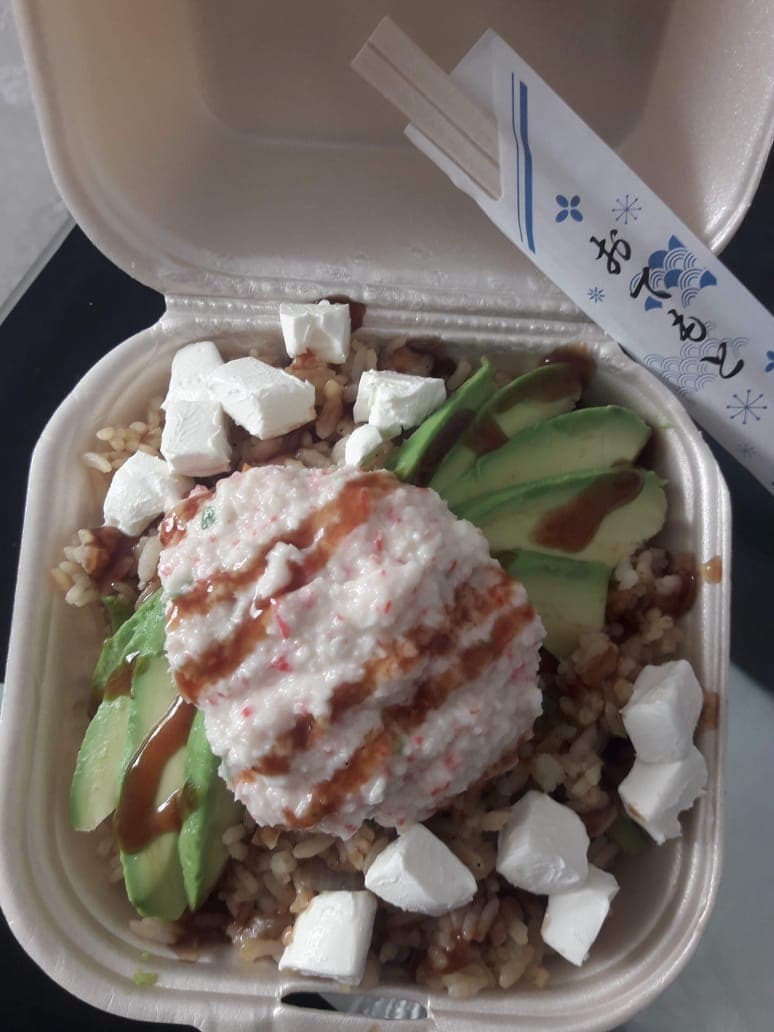 arroz frito con verduras en mantequilla con pollo,filete y camarón, con aguacate tampico cebollín y un toque agridulce