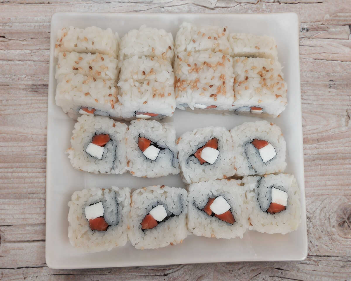 por dentro: queso filadelfia con salmón, fuera: arroz y ajonjolí