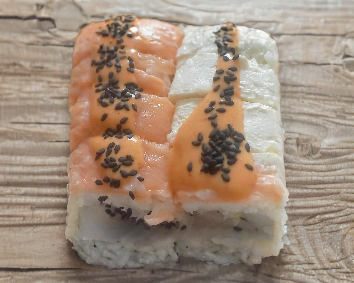 dos capas de arroz rellena de queso filadelfia, aguacate, pepino y salmón con un ligero toque de ajonjolí.