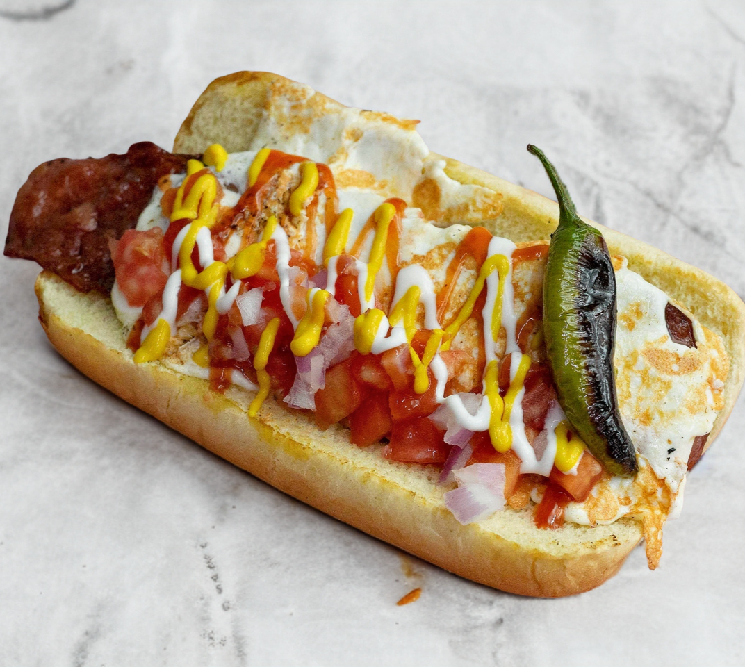 Salchicha de Pavo, Tocino, Cebolla, Jitomate, Chile Morrón Frito y Aderezos.