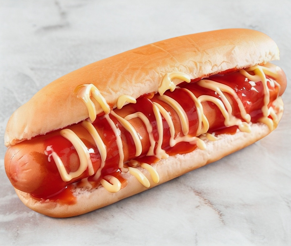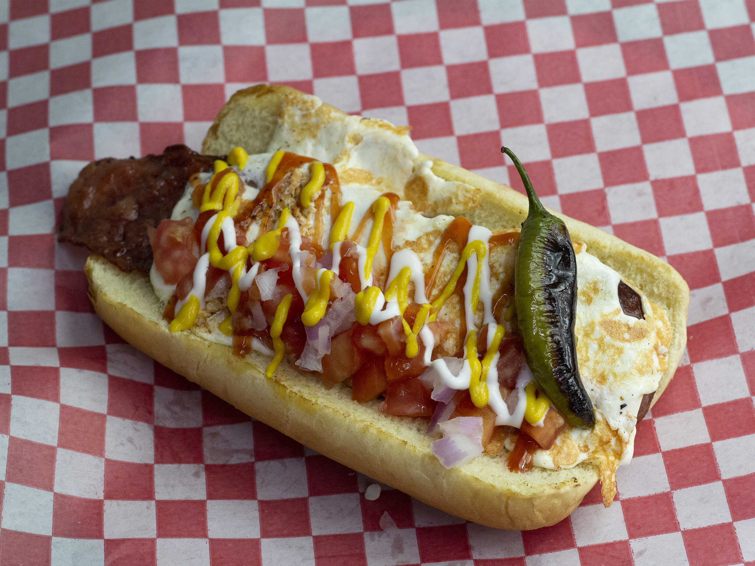 Salchicha, tocino, queso blanco, jamón, queso amarillo, lechuga, jitomate, cebolla, crema, catsup, mostaza.