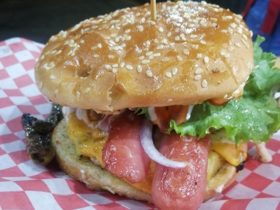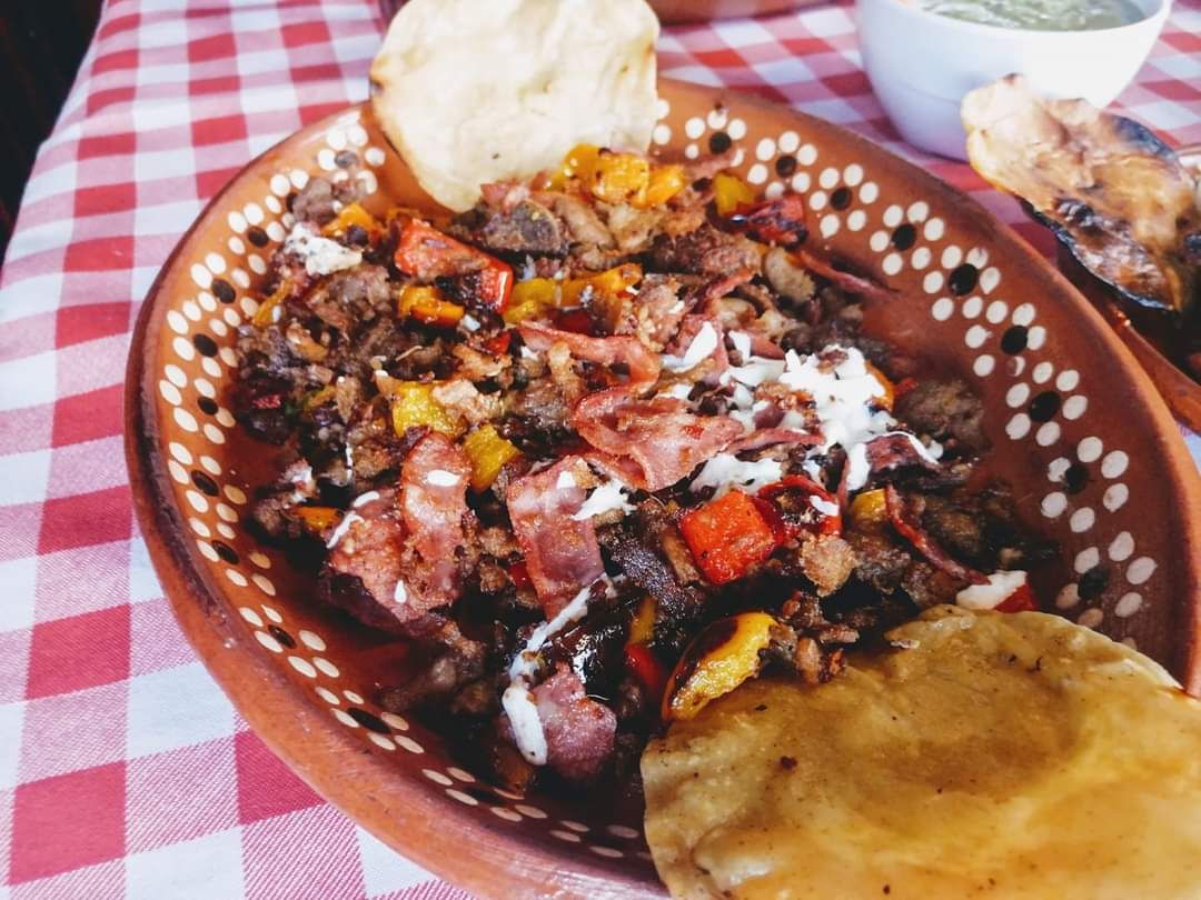 Tocino con queso Oaxaca derretido, Jitomate, cebolla, crema, catsup, mostaza y mayonesa.