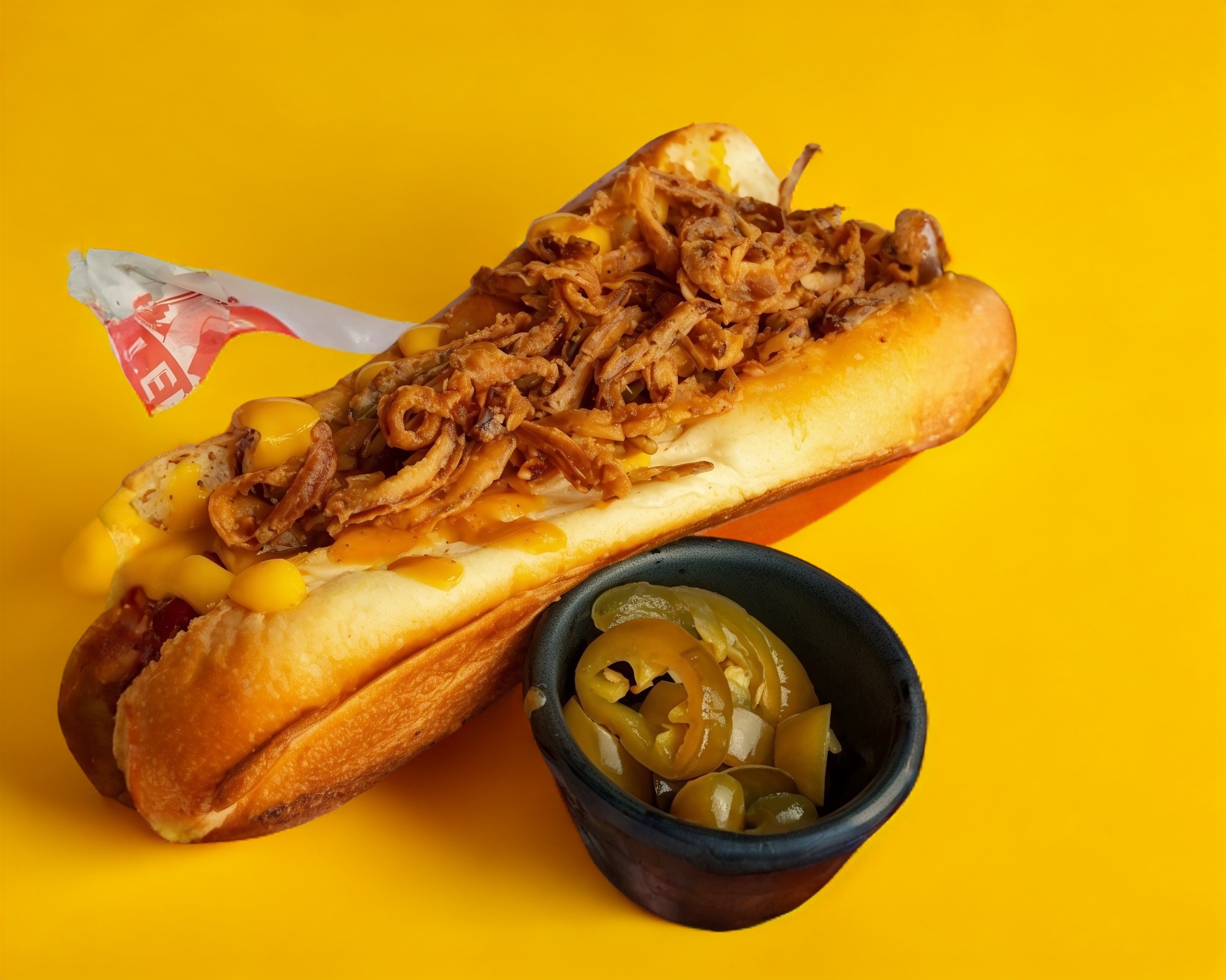 Salchicha jumbo ahumada con chili beans, queso cheddar y cebollas crujientes.