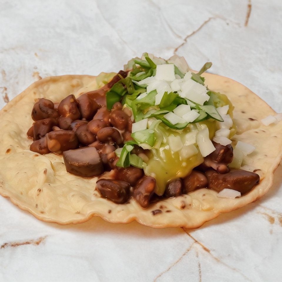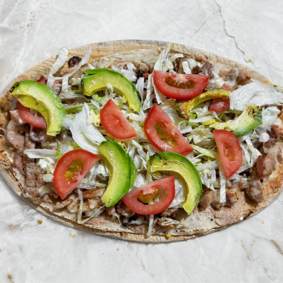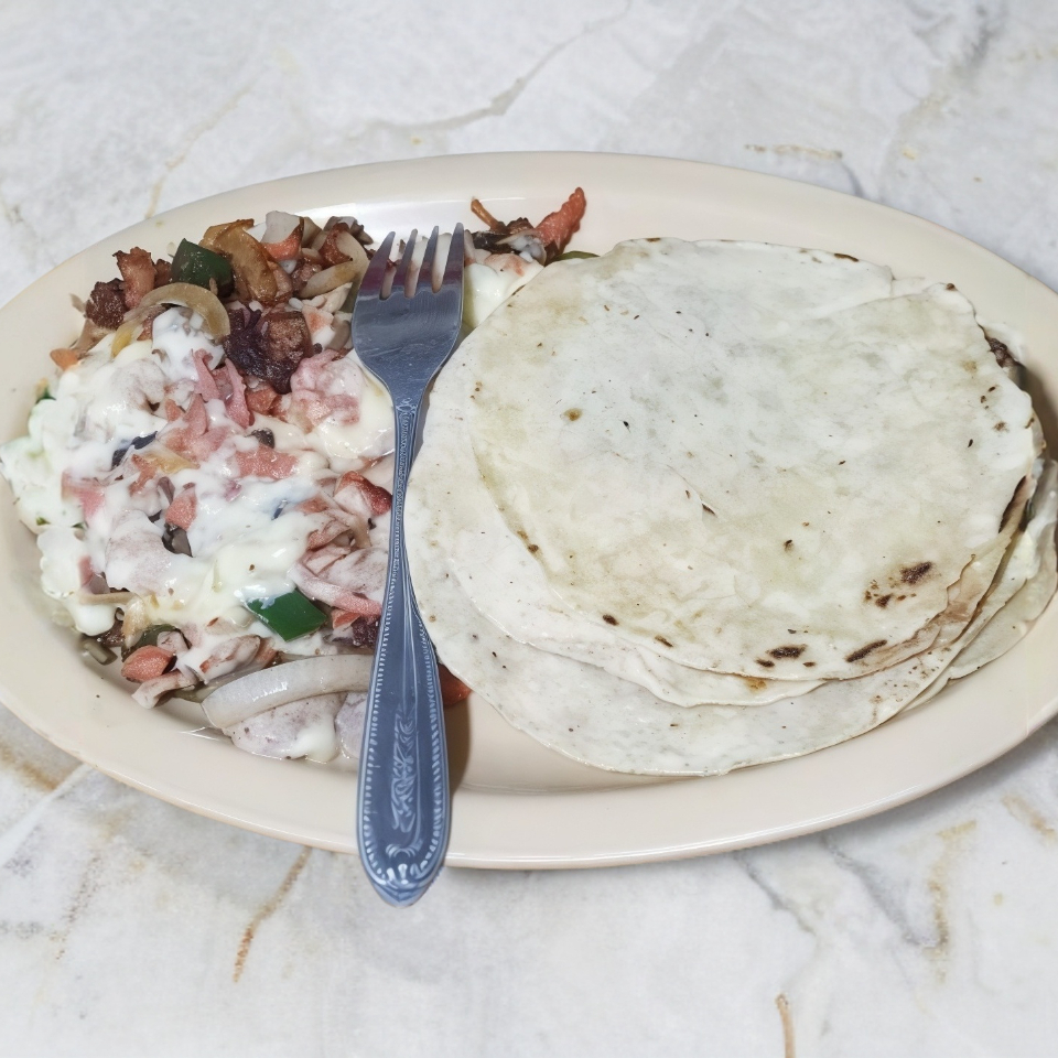 Bistec, pastor, chorizo, poblano, cebolla y queso.