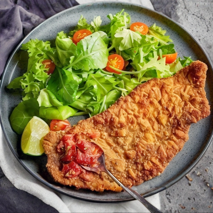 Milanesa acompañada de ensalada, lechuga, jitomate y aguacate.