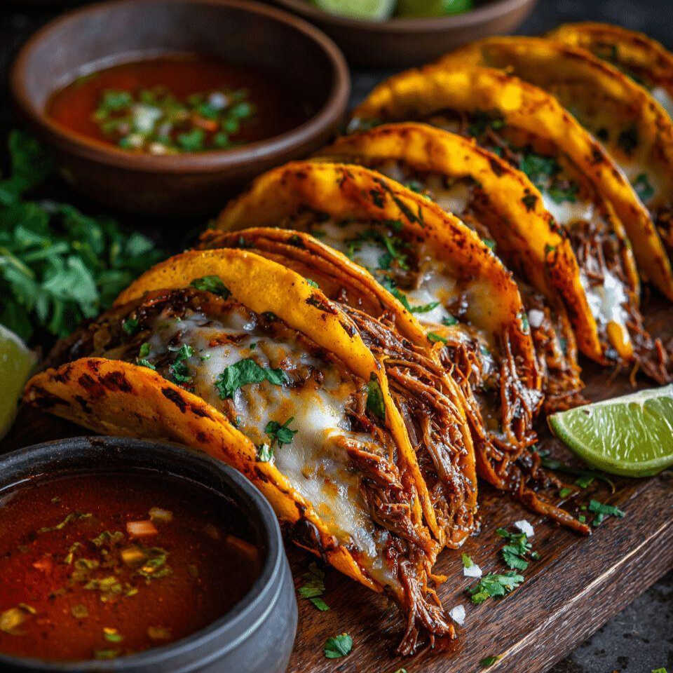 Taco de birria dorado a la plancha para obtener una textura crujiente.