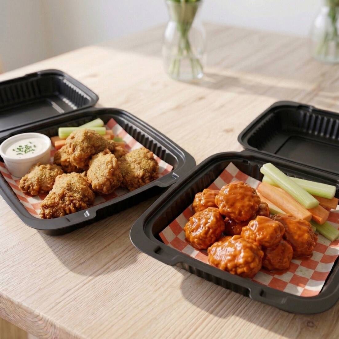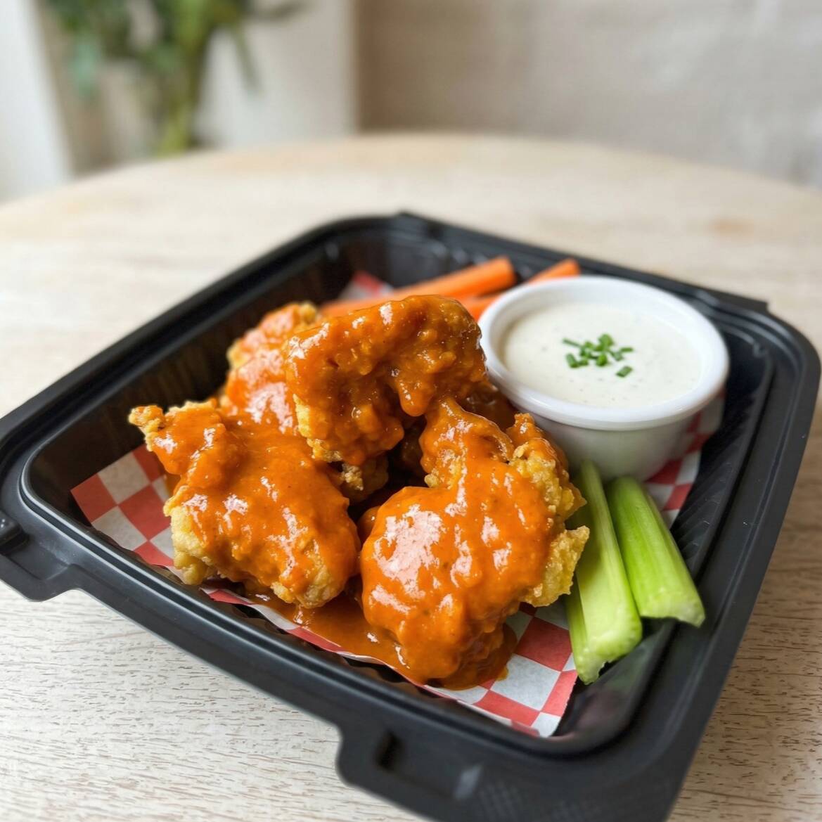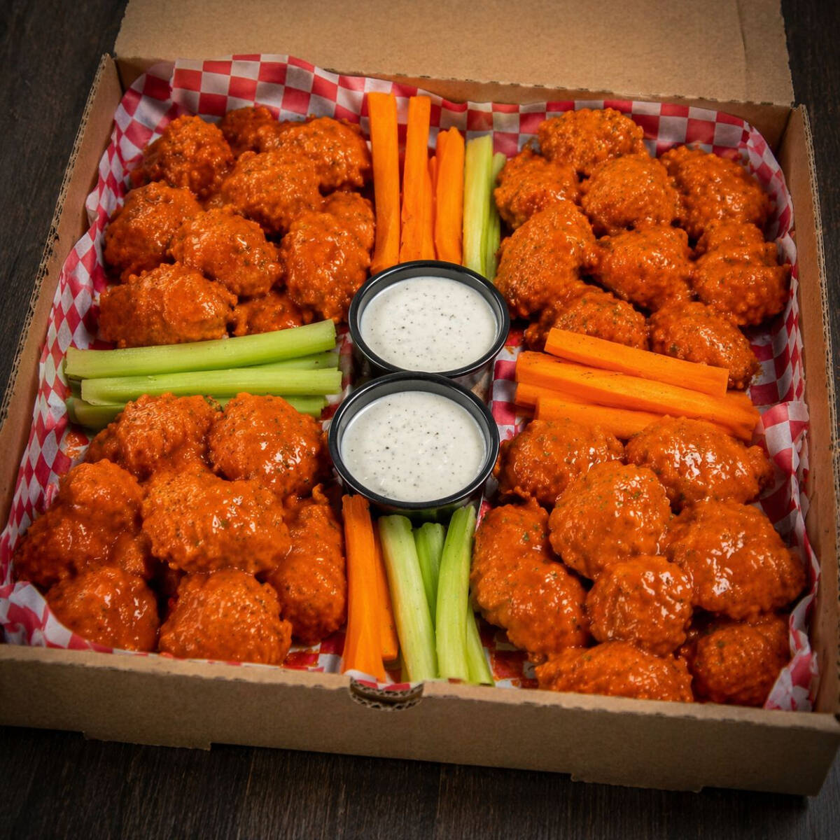 Orden de 600gr con papas, 2 aderezos ranch, zanahoria y apio. Puedes escoger hasta 4 salsas diferentes.