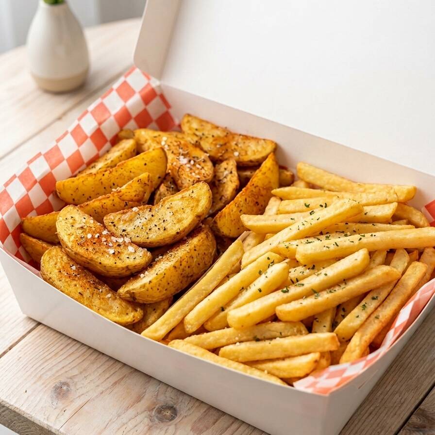 Orden de 150g de papas gajo de la casa y 150g de papas fritas.