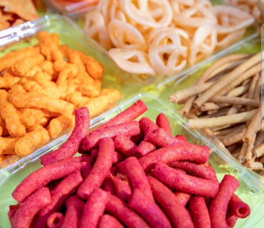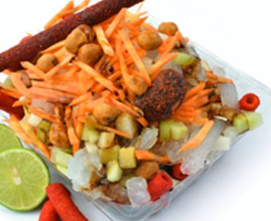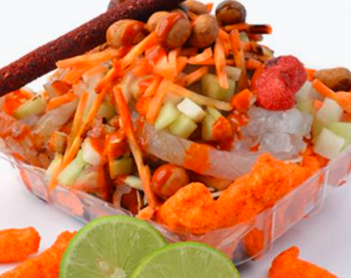 Takis con verdura, cueritos, salsas, Clamato, cacahuates y gomitas de chamoy.