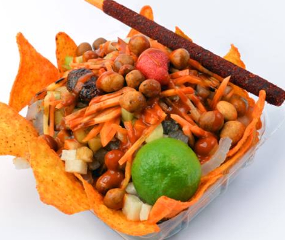 Doritos con verdura, cueritos, salsas, Clamato, cacahuates y gomitas de chamoy.