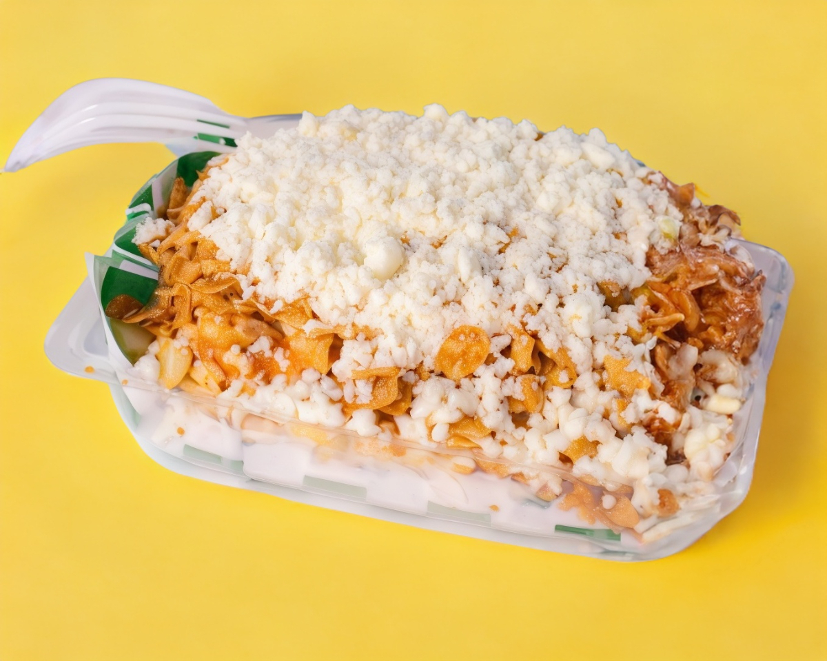 Deliciosos chilaquiles en Salsa *VERDE, con crema y queso, seguido de una capa de elotes calientitos preparados con crema, mayonesa, queso amarillo y queso rayado, salsa tarasca y al ultimo salsas: Guajillo, o arbol, o cacahuate, o habanero.