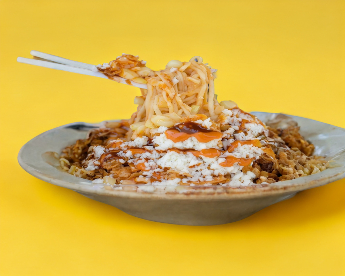 Elote, fideos de ramen, queso rayado, crema, mayonesa,