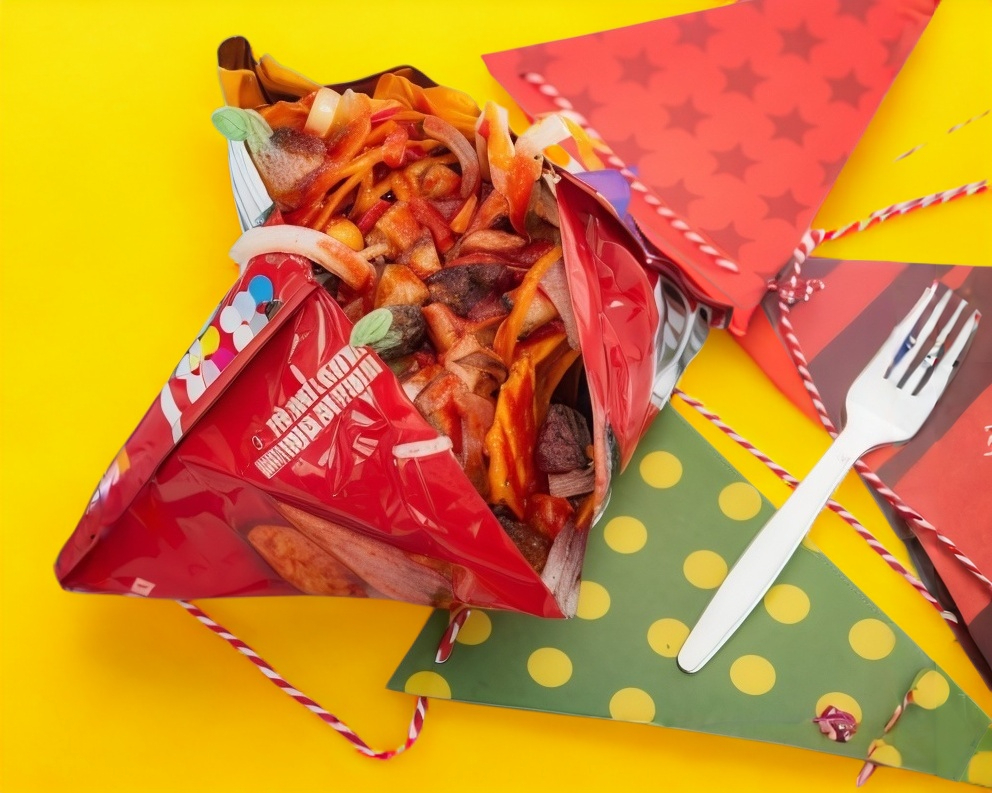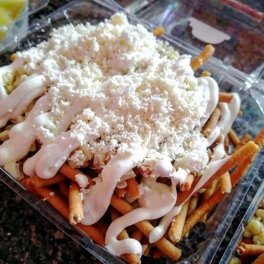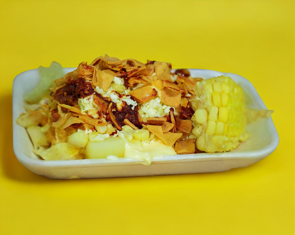 Doritos Nacho preparados con Ramen, papa y Elote adicionado con queso amarillo, crema, mayonesa, Queso rayado, Salsas y/o chiles