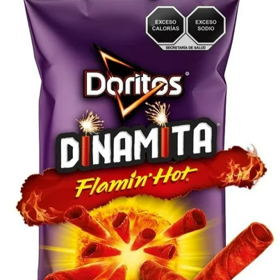 Doritos Dinamita, elote, queso amarillo, crema, mayonesa, queso rayado, salsa guajillo, cacahuate japonés y salsa tarasca.