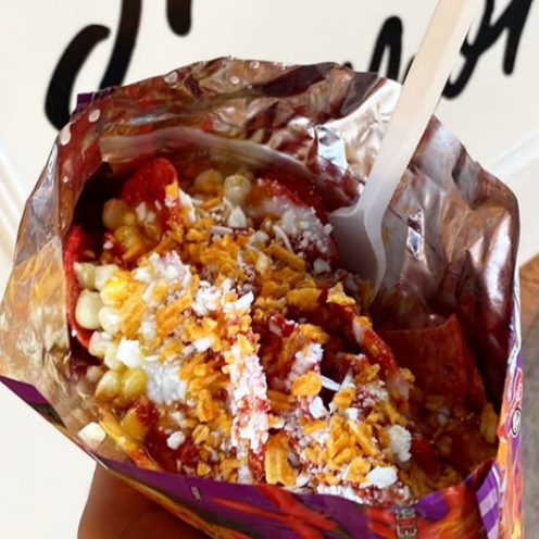 Tostitos Flaming hot con elote, queso amarillo, crema, mayonesa, queso rayado, salsa guajillo, cacahuate japonés y salsa tarasca.