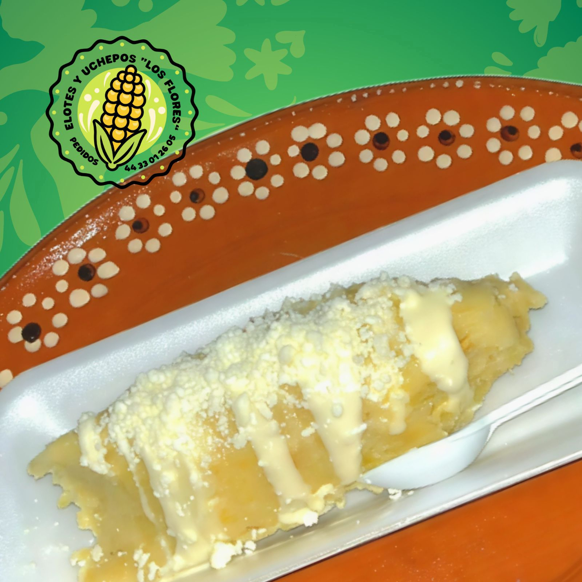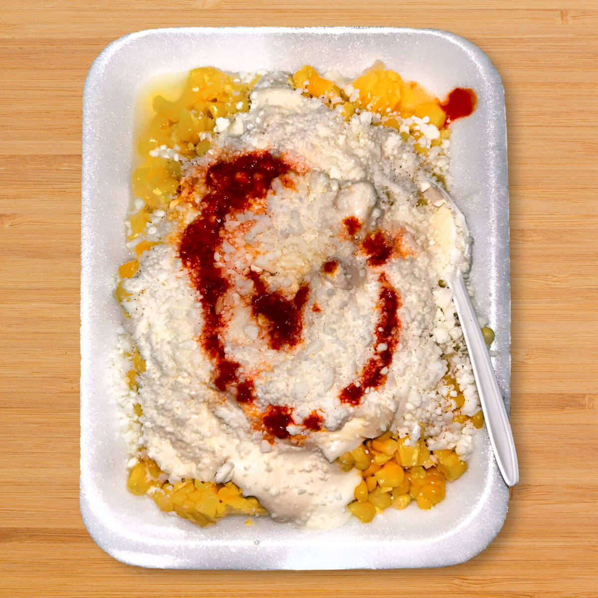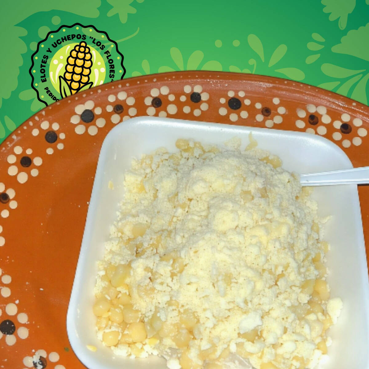 Elote preparado con crema y/o mayonesa, queso y salsa.