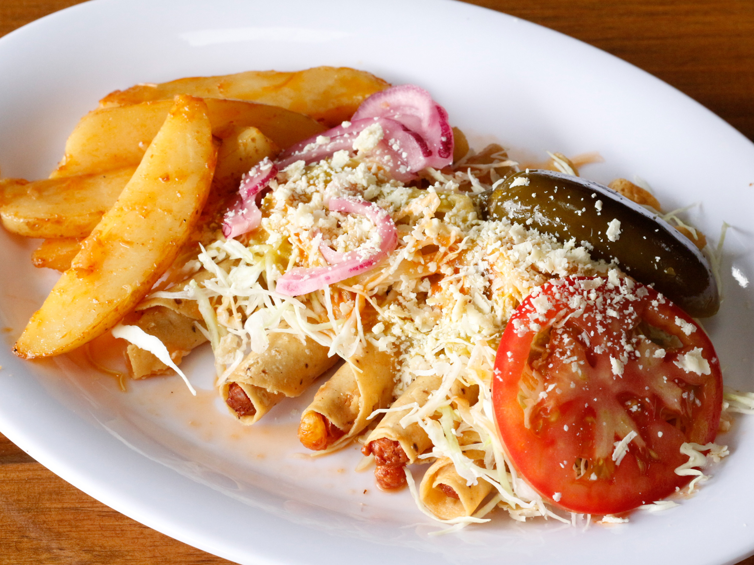 Tacos dorados rellenos de pollo o adobera, acompañados con verdura y salsas.