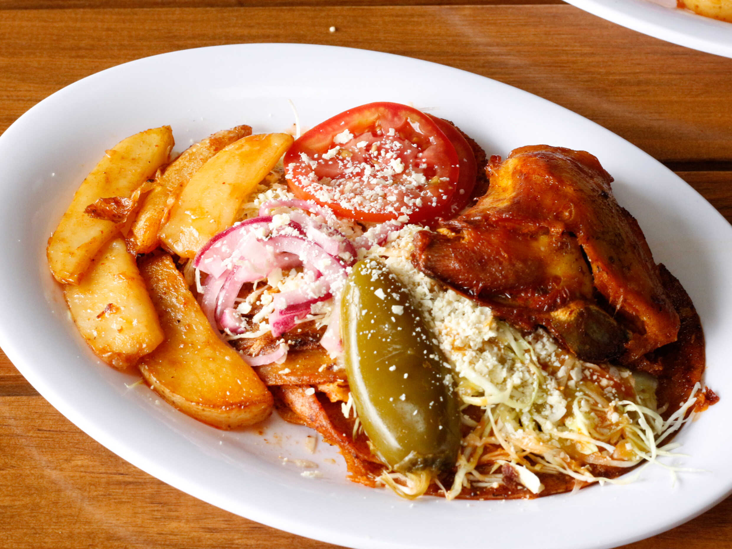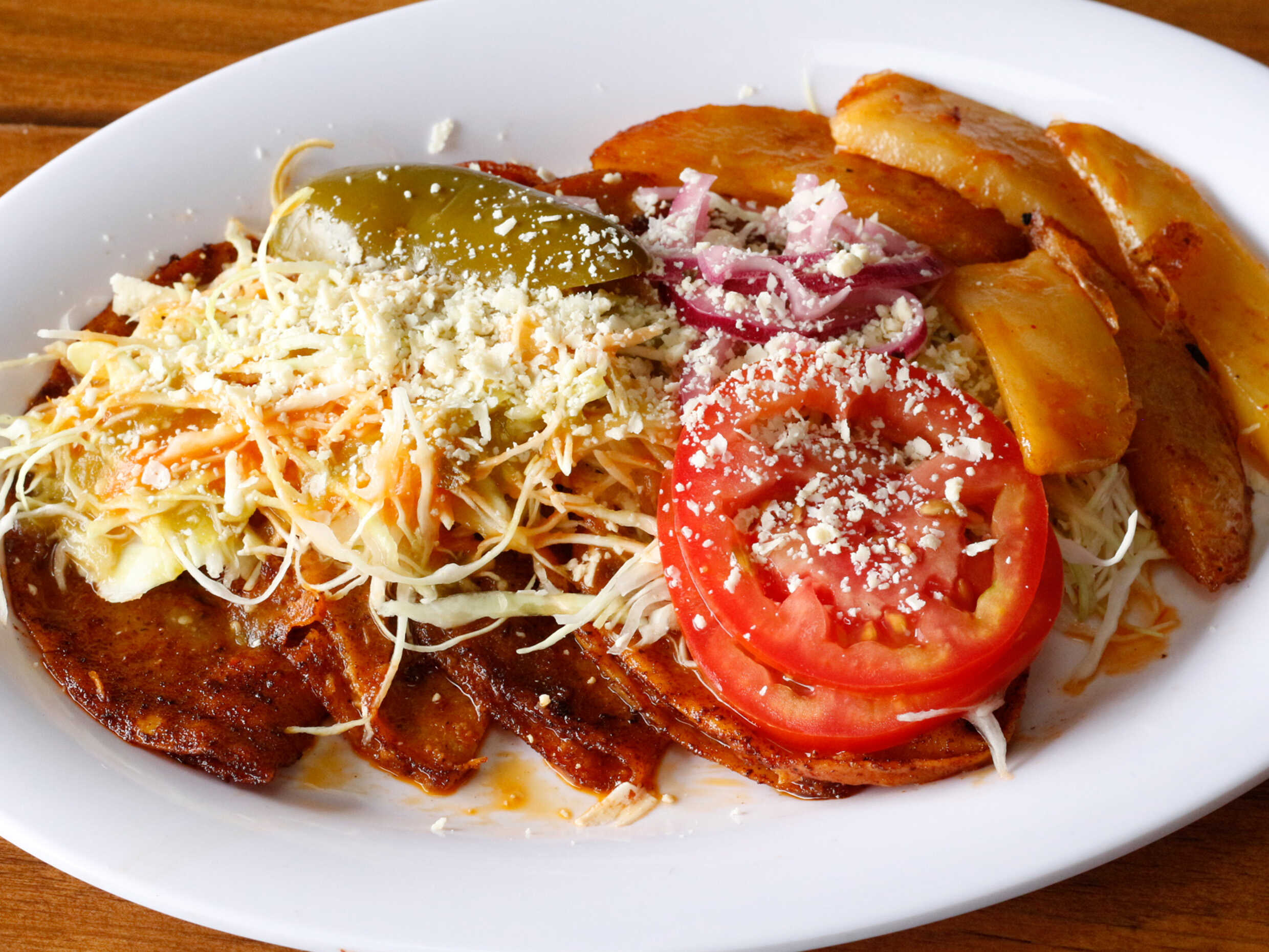 Papas gajo bañadas en la salsa de las enchiladas.