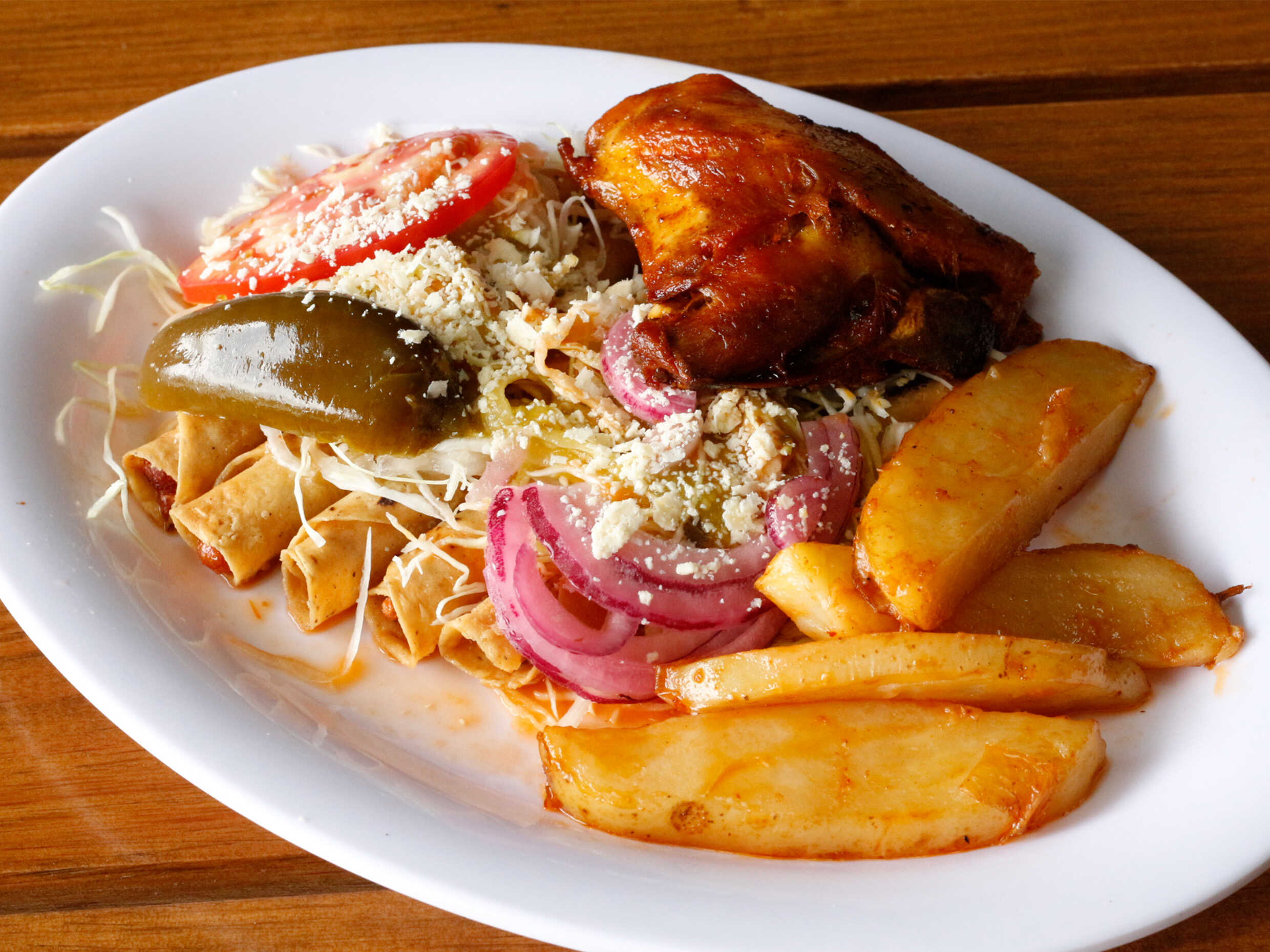 5 Tacos dorados rellenos de pollo o adobera, acompañados con verduras, salsas y una pieza de pollo, pierna