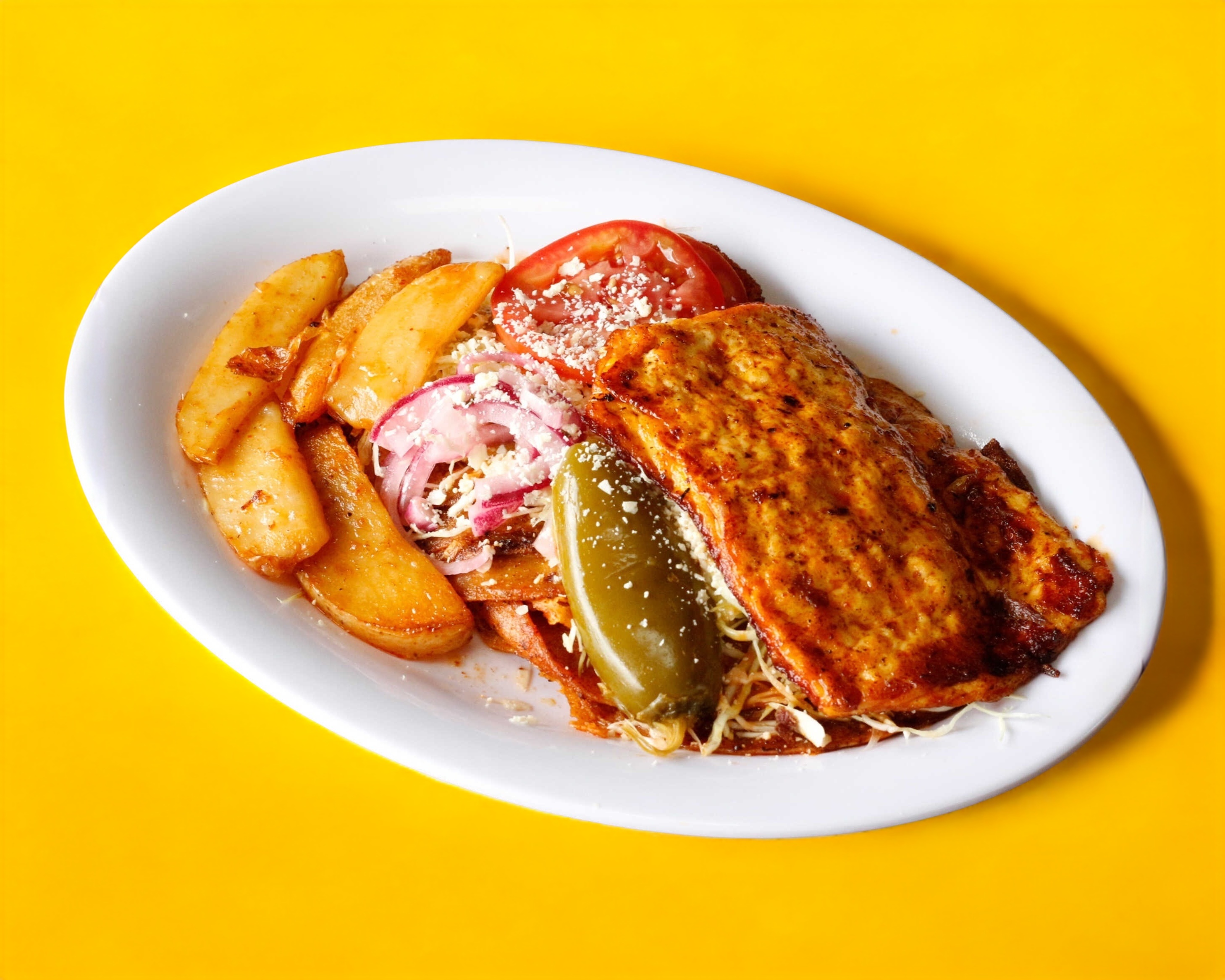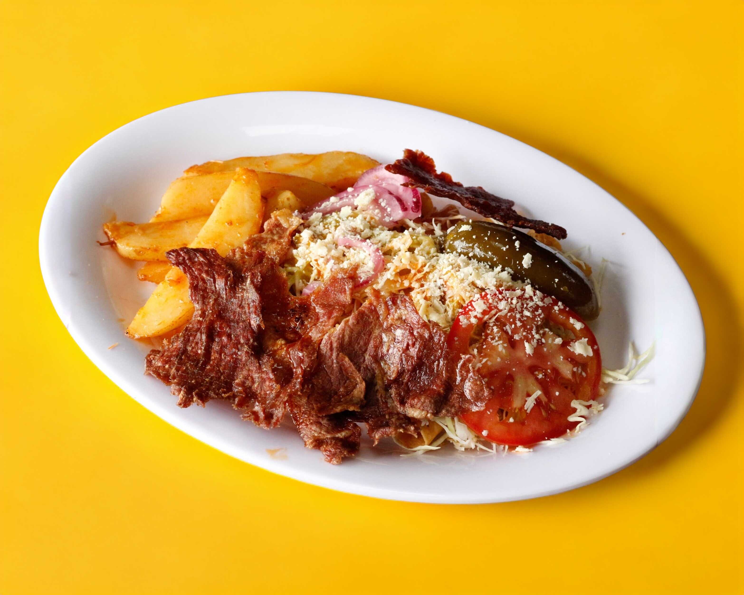 5 Tacos dorados rellenos de adobera, acompañados con verdura, salsas y cecina dorada.