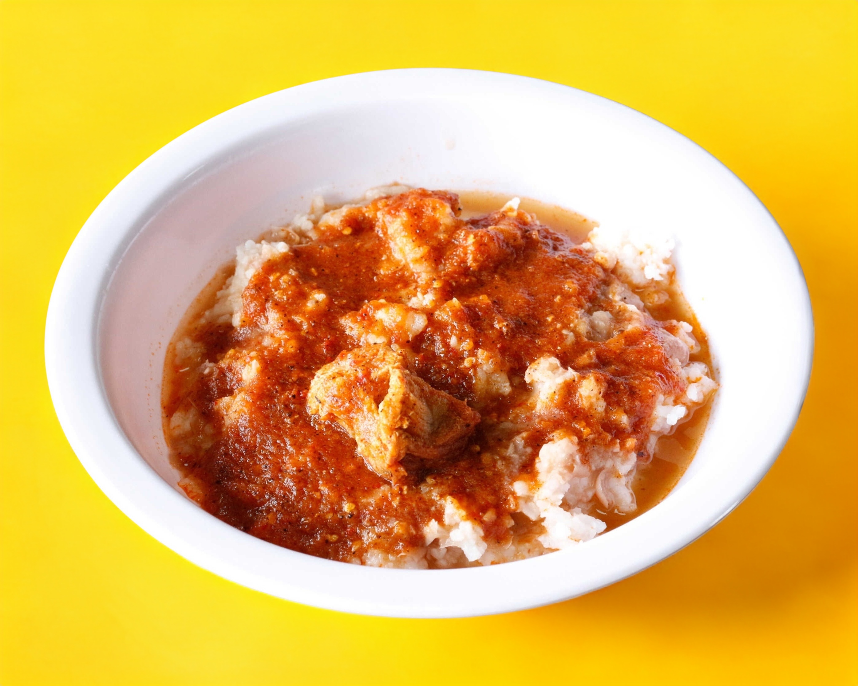Arroz blanco bañado con frijoles y carne de puerco en salsa roja.