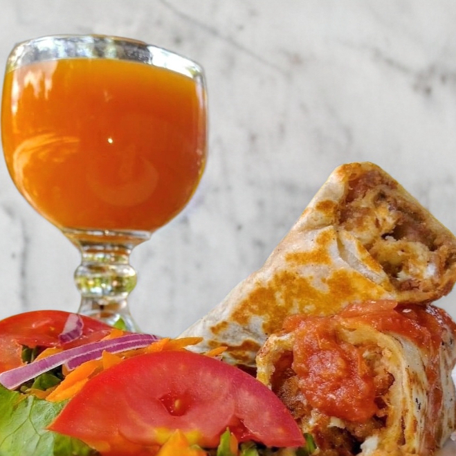 1/2 litro de jugo combinado de naranja, piña, perejil, nopal y espinaca.
