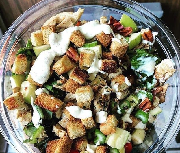 Lechuga, espinaca, apio, zanahoria, manzana, nuez, crotones+ proteina