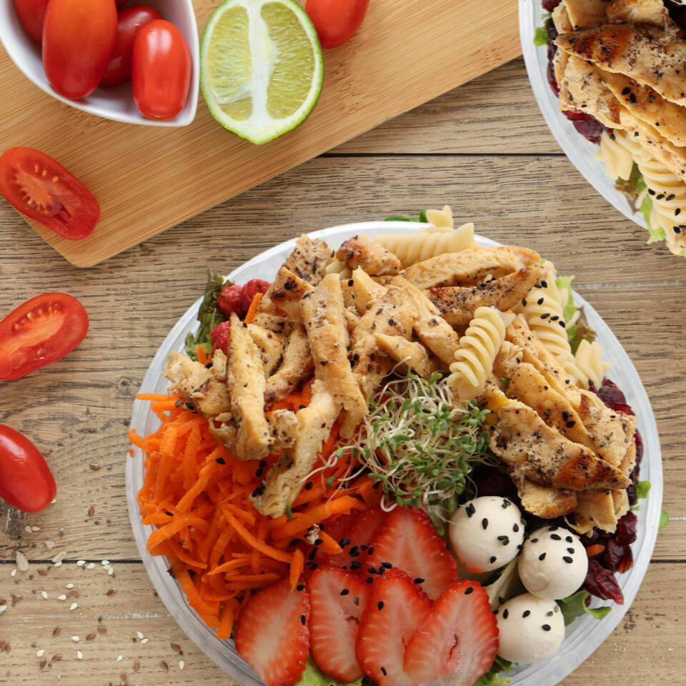 Fresa o manzana, queso Philadelphia, cacahuate garapiñado, zanahoria, arándano, pasta y crutones. Proteína y aderezo a elegir.