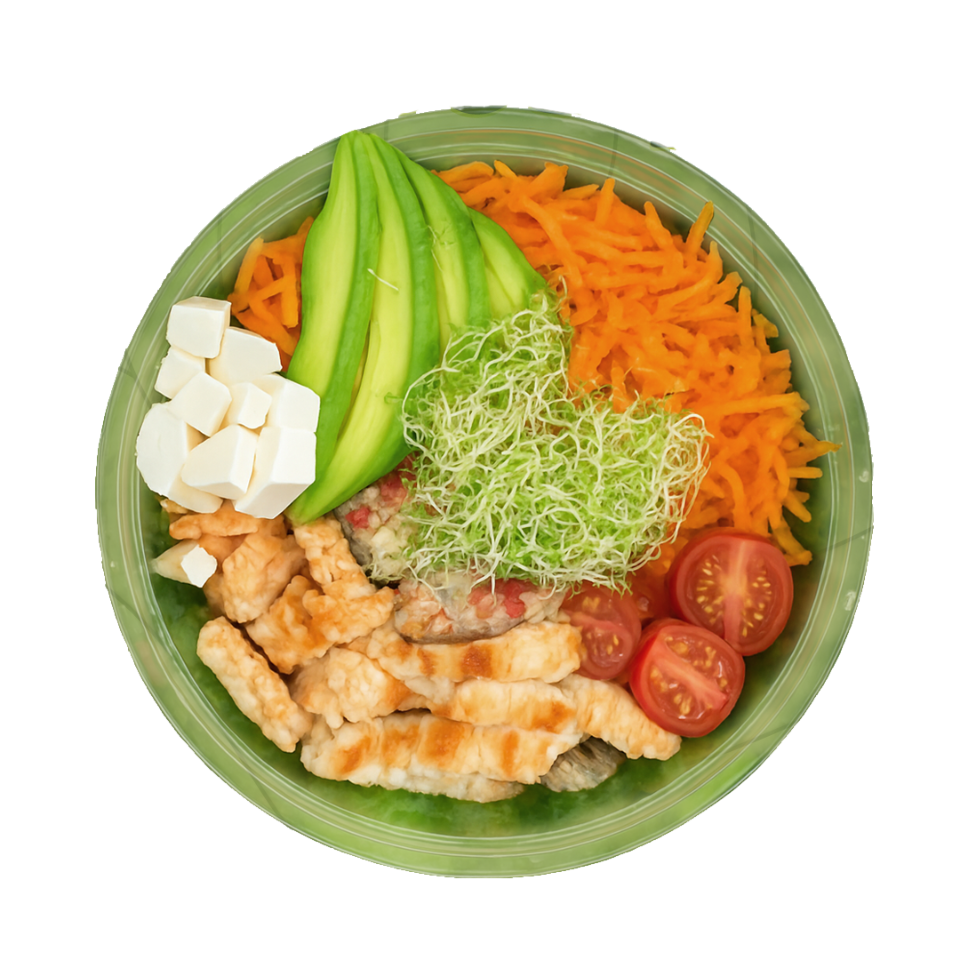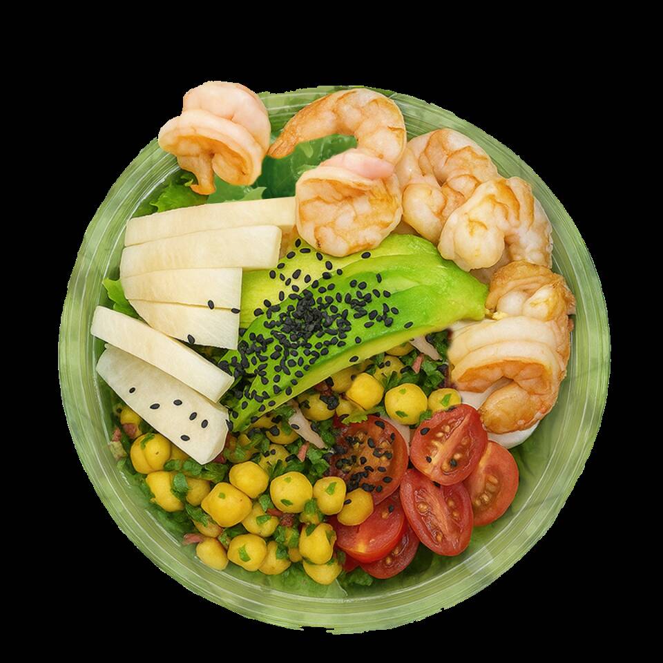 De harina, mix de lechugas, jitomate cherry, aguacate, elote amarillo, mix de quesos y la proteina de tu preferencia.