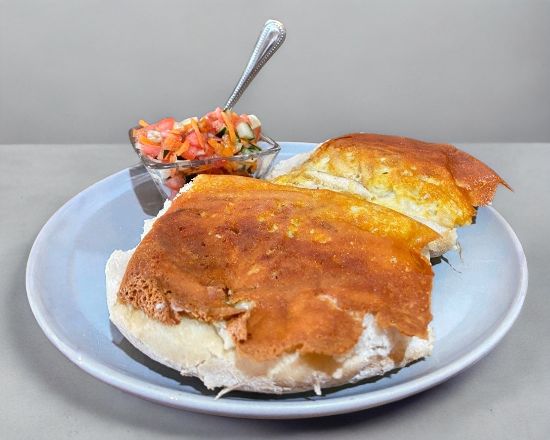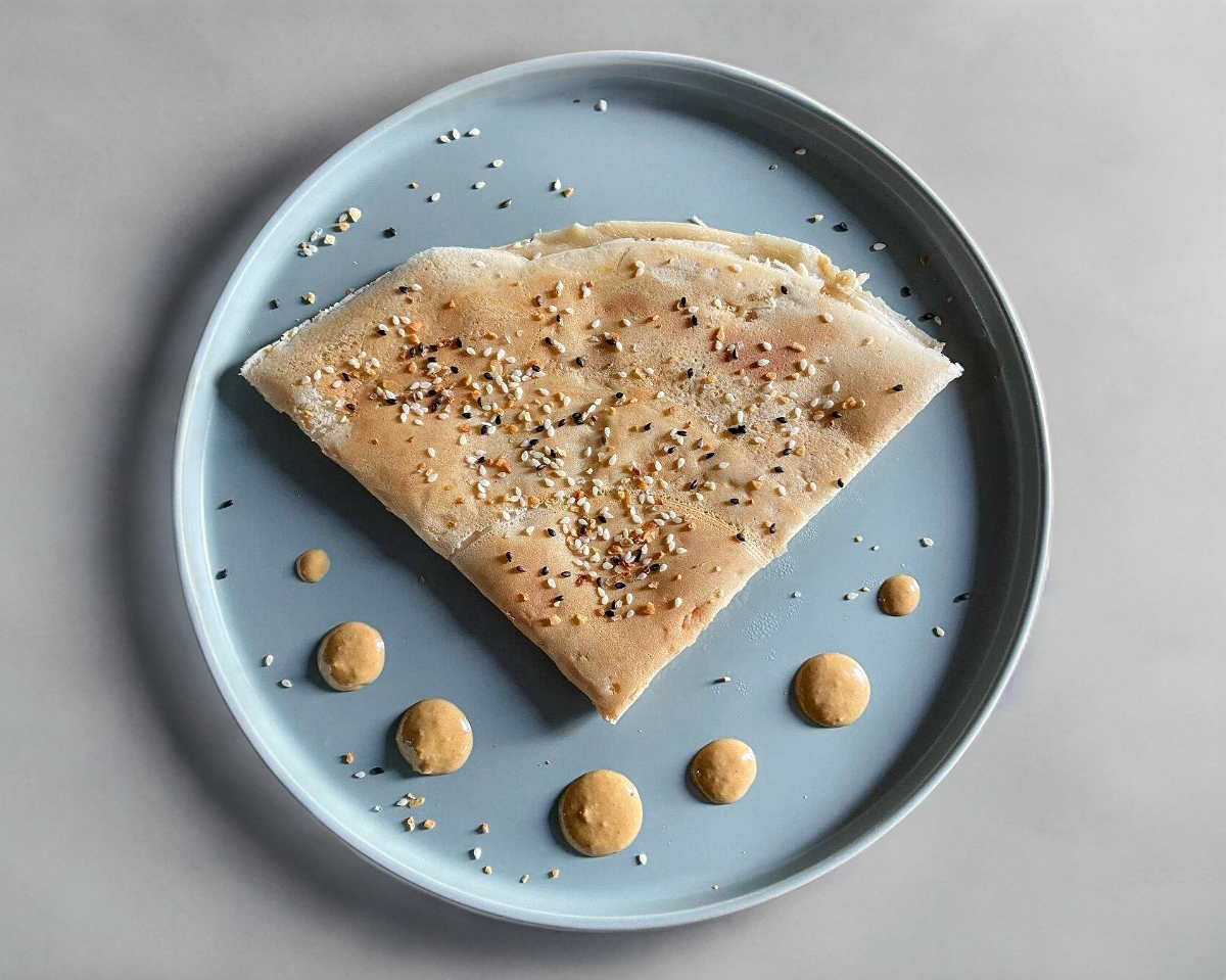 Crepa a base de Harina de trigo, rellena de Queso Manchego y Jamón de Pavo, sazonada con everything baegel..
