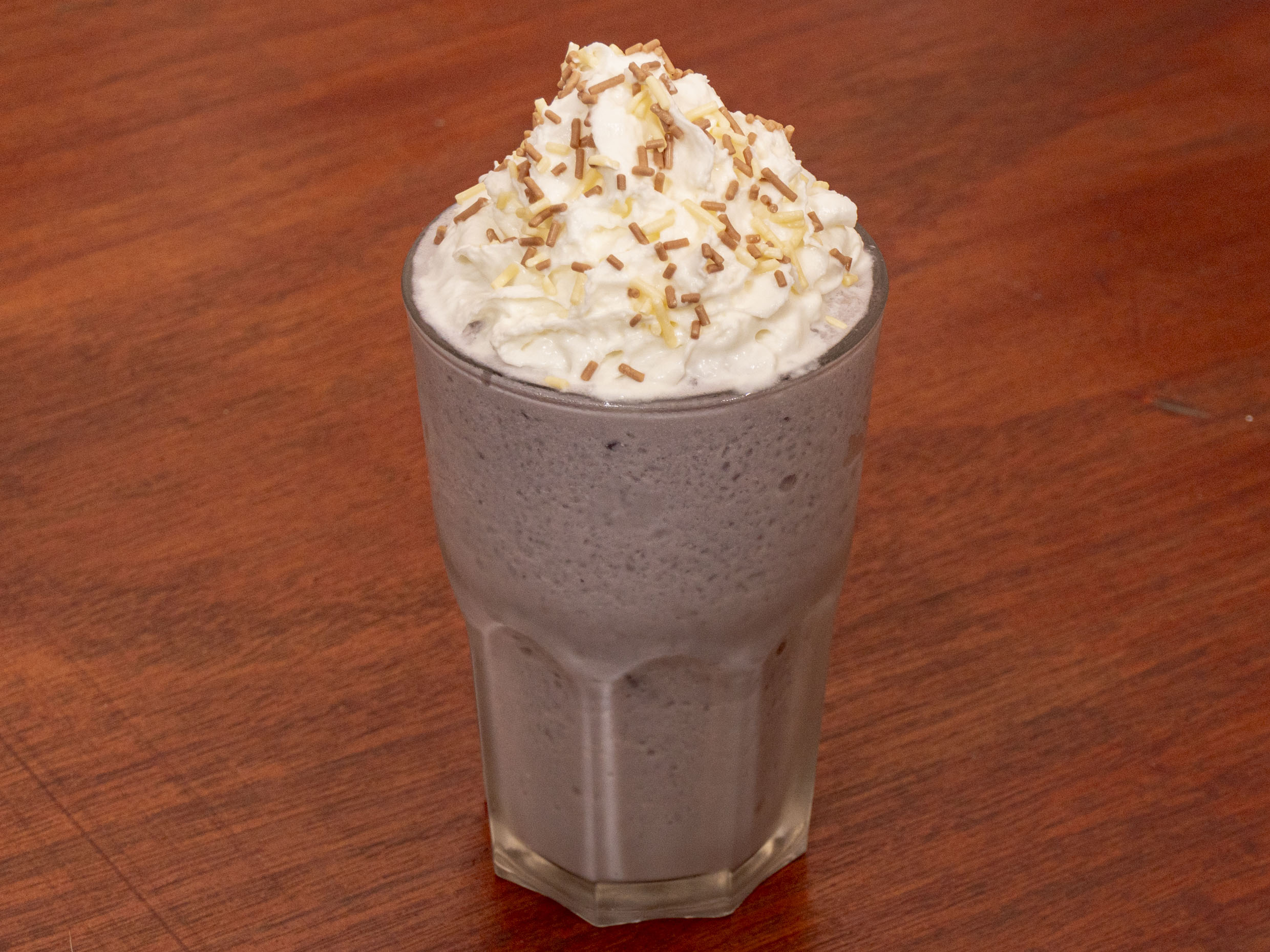 Frappe de taro con crema batida. Bebida de 12 oz
