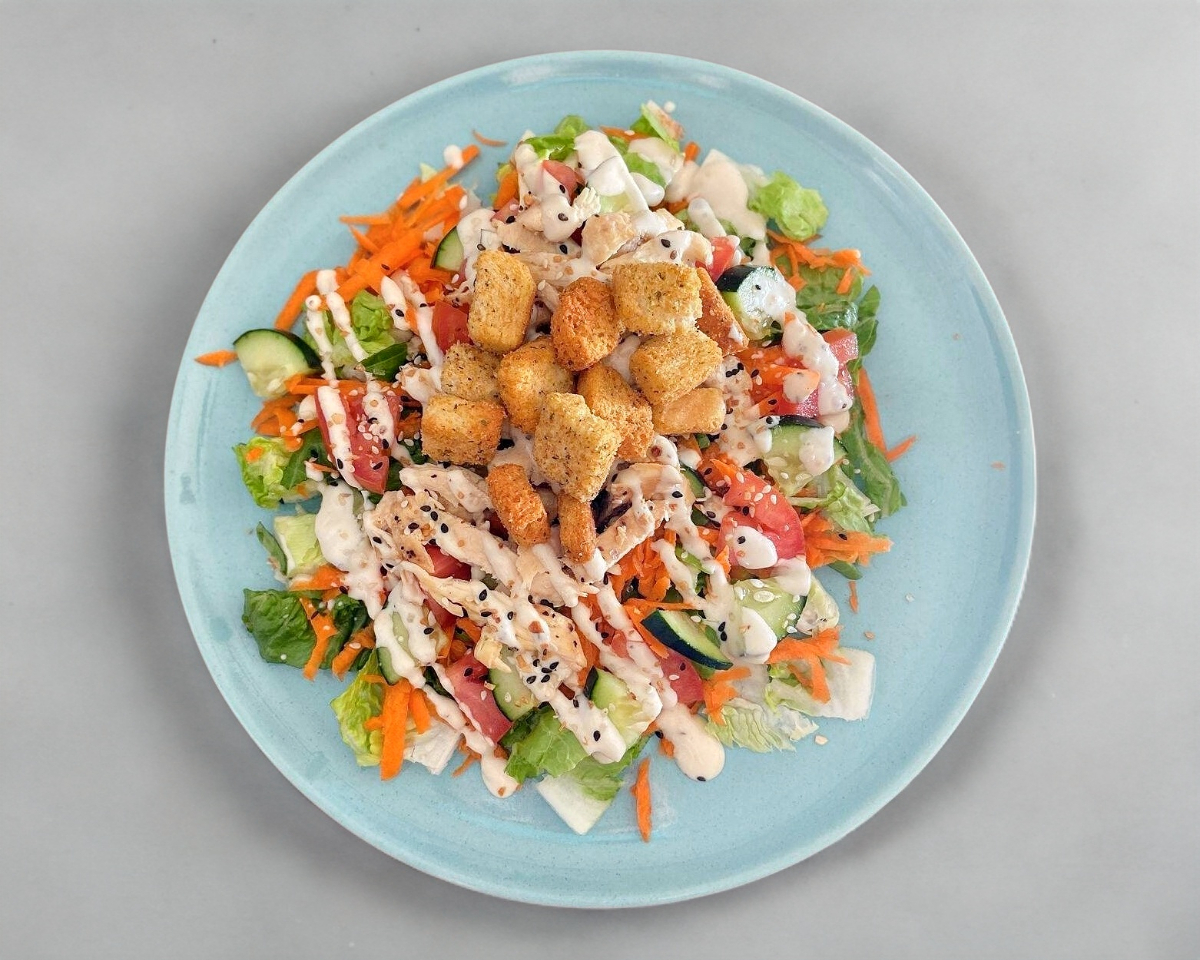 Abundante Lechuga, Zanahoria rallada, jitomate, pepino, ajonjoli tostado, aderezo cesar, pollo y crotones.