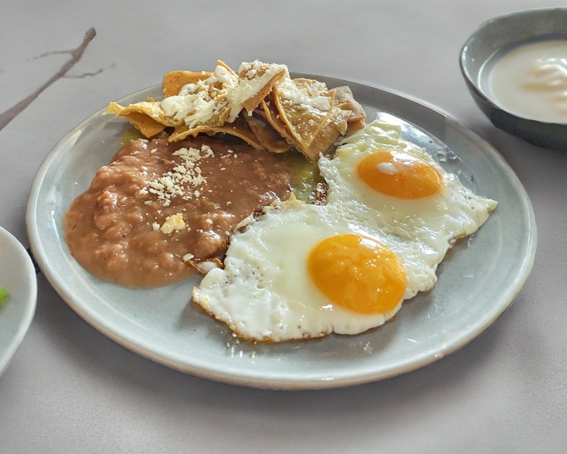 Totopo frito bañado en salsa verde con 2 huevo estrellado, acompañado de frijoles, queso y crema.