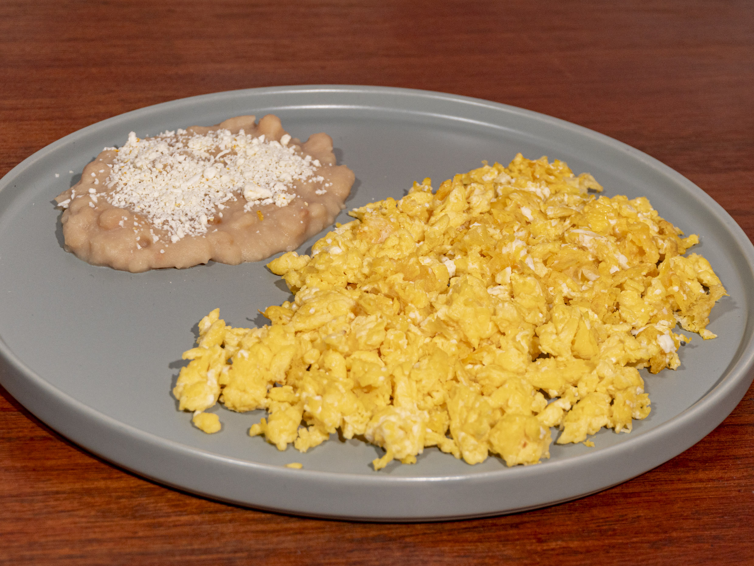 3 Huevos revueltos acompañado de frijoles refritos y quesillo fresco.