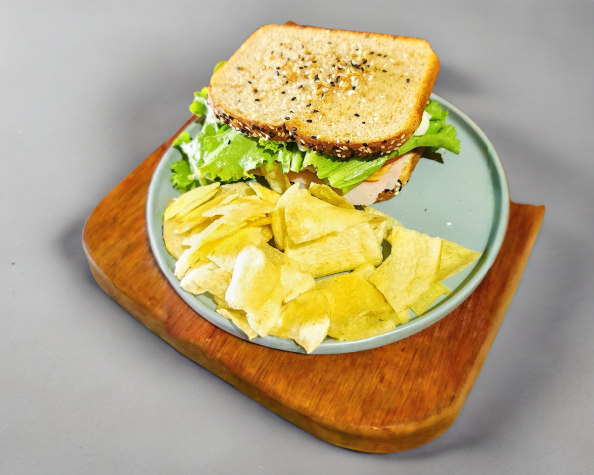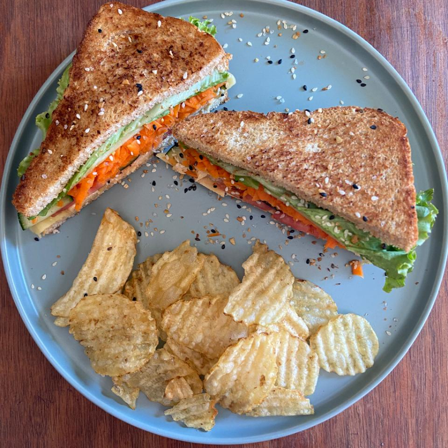 Pan de masa madre dorado en parrilla con Queso Gouda y mayonesa, vegetales (Zanahoria rallada finamente, pepino, jitomate, lechuga), sazonado con ajonjolí y ajo tostado. "Incluye papas fritas"