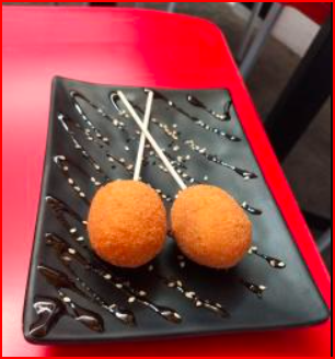 Bola de arroz empanizada rellena de quesos.