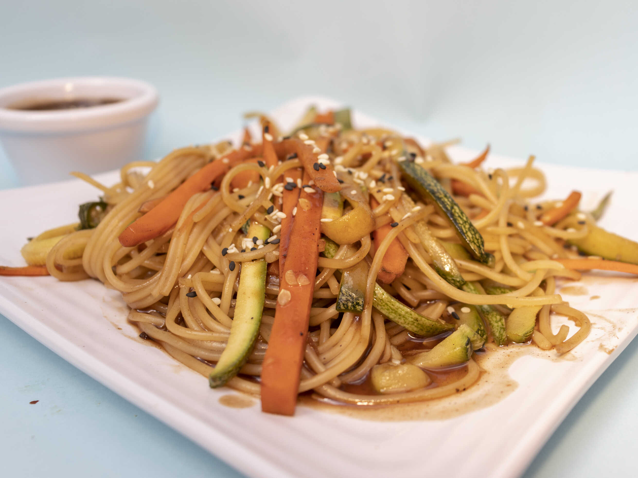 Pasta delgada agridulce con julianas de zanahoria y calabacita