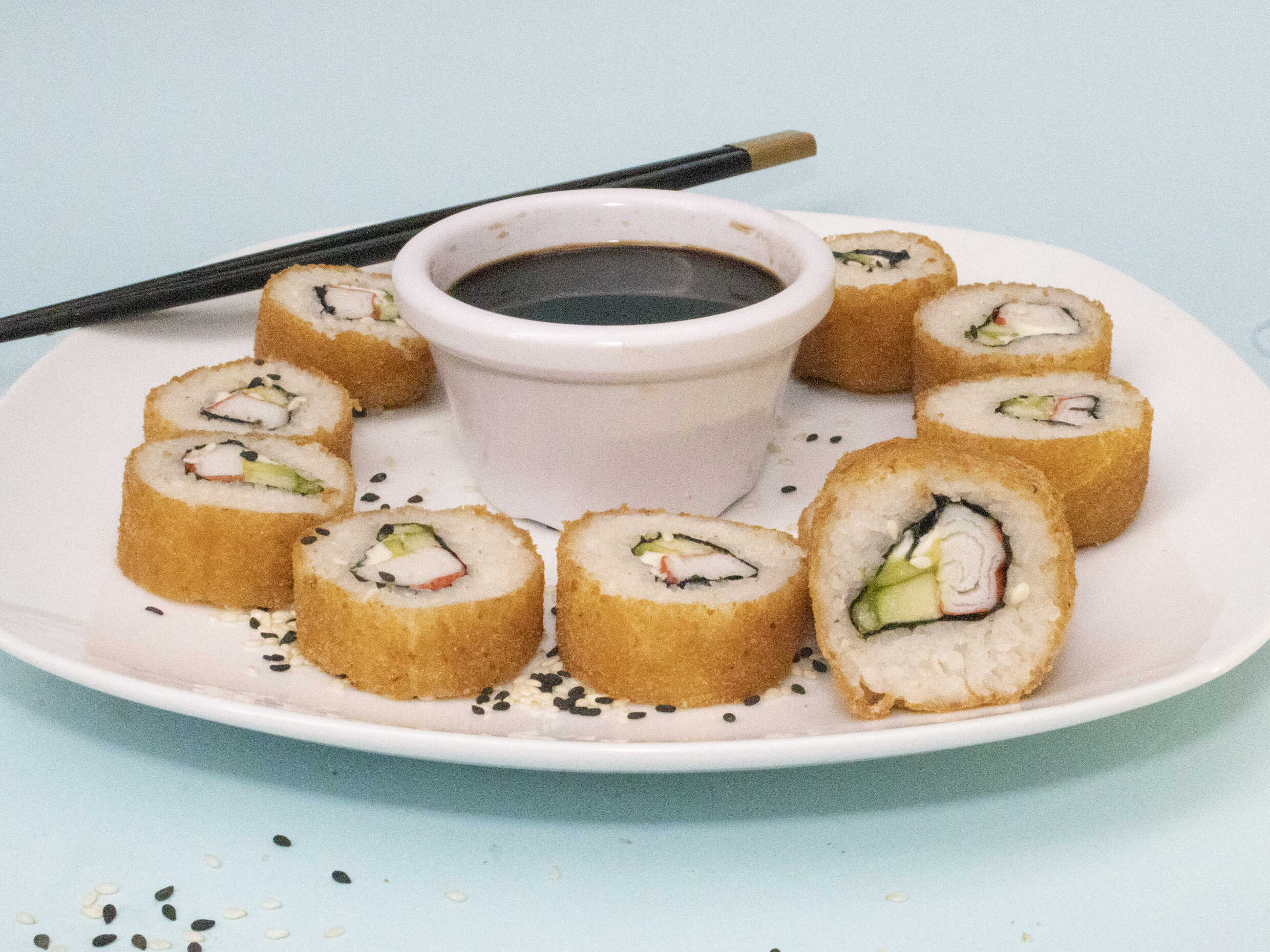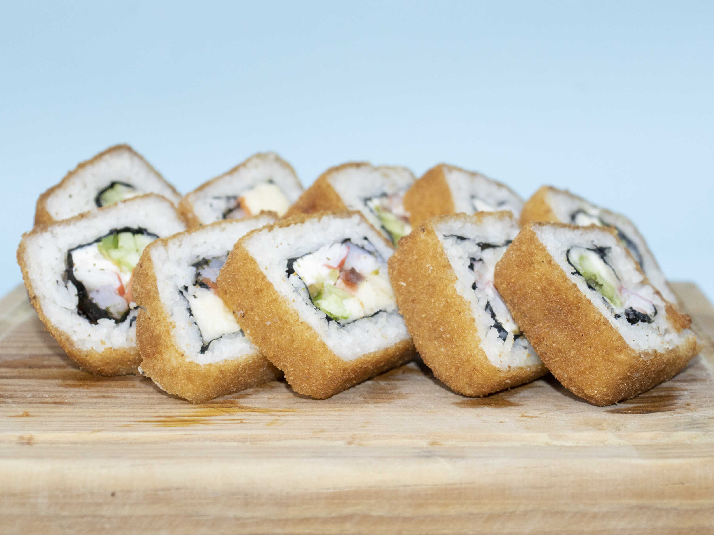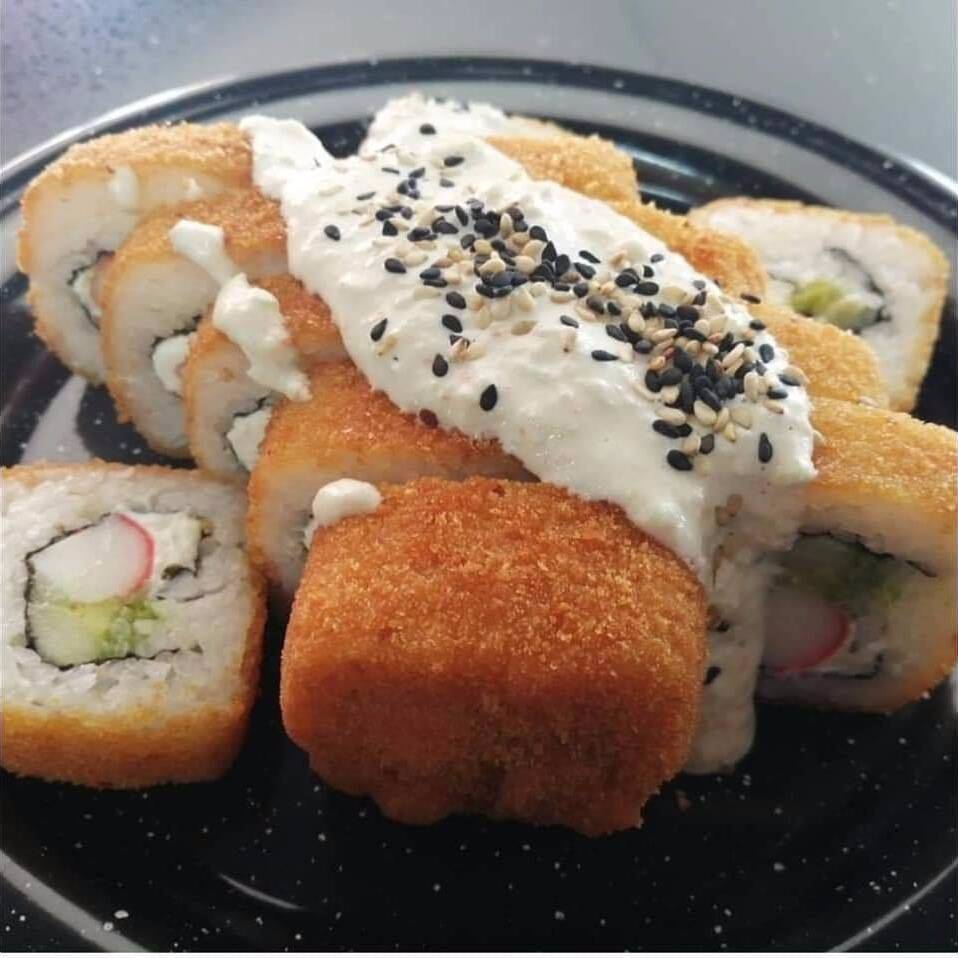 Empanizado relleno de Surimi, pepino, aguacate y philadelphia. Fuera: Tampico, Soya y Kushague
