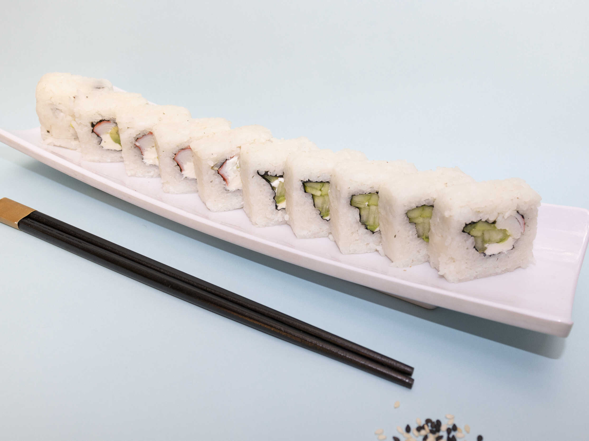 Rollo natural relleno de Surimi, queso Philadelphia, aguacate y pepino. Soya