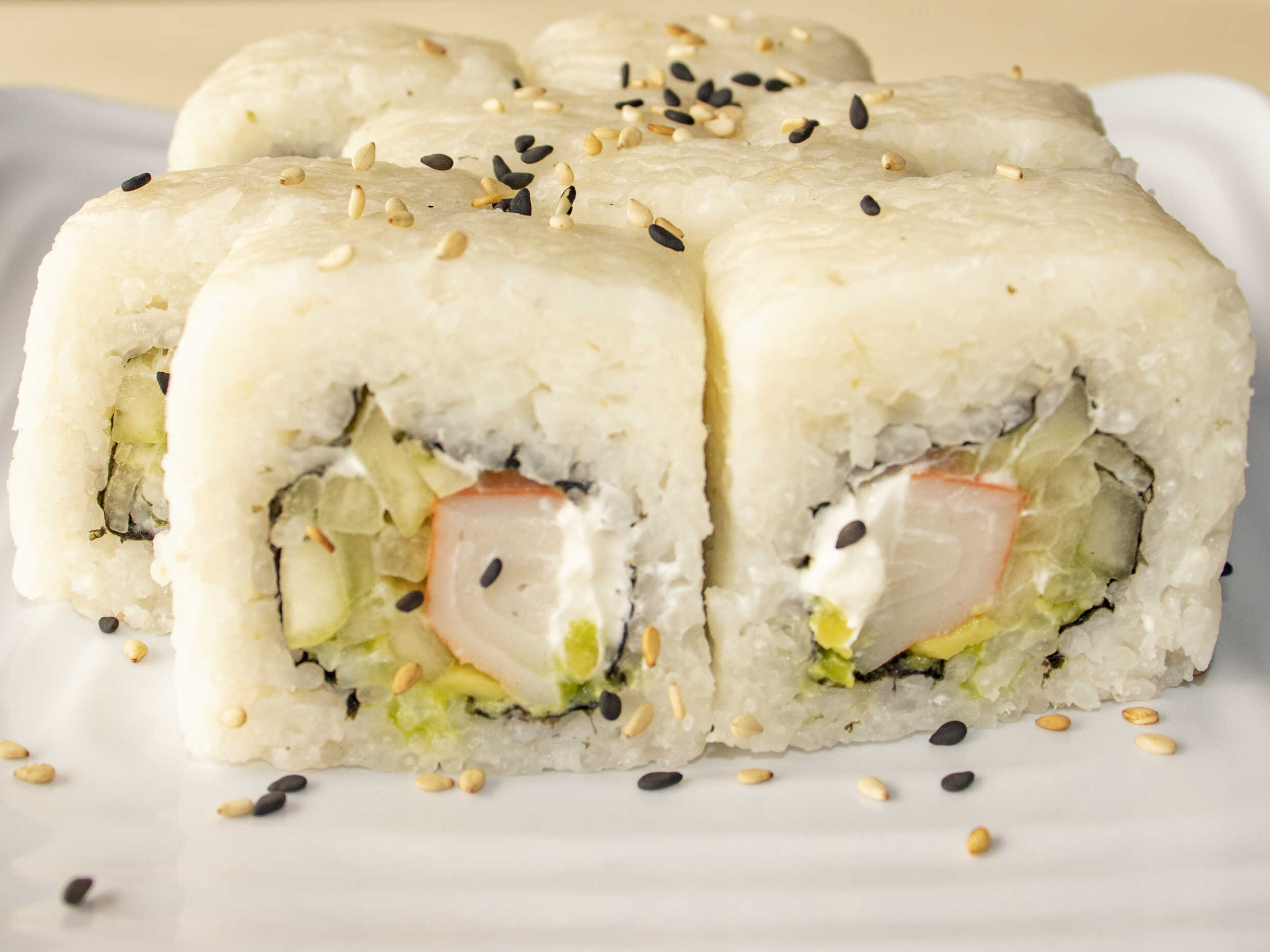 D: Camarón, philadelphia, aguacate y pepino. F: Masago y ajonjolí.