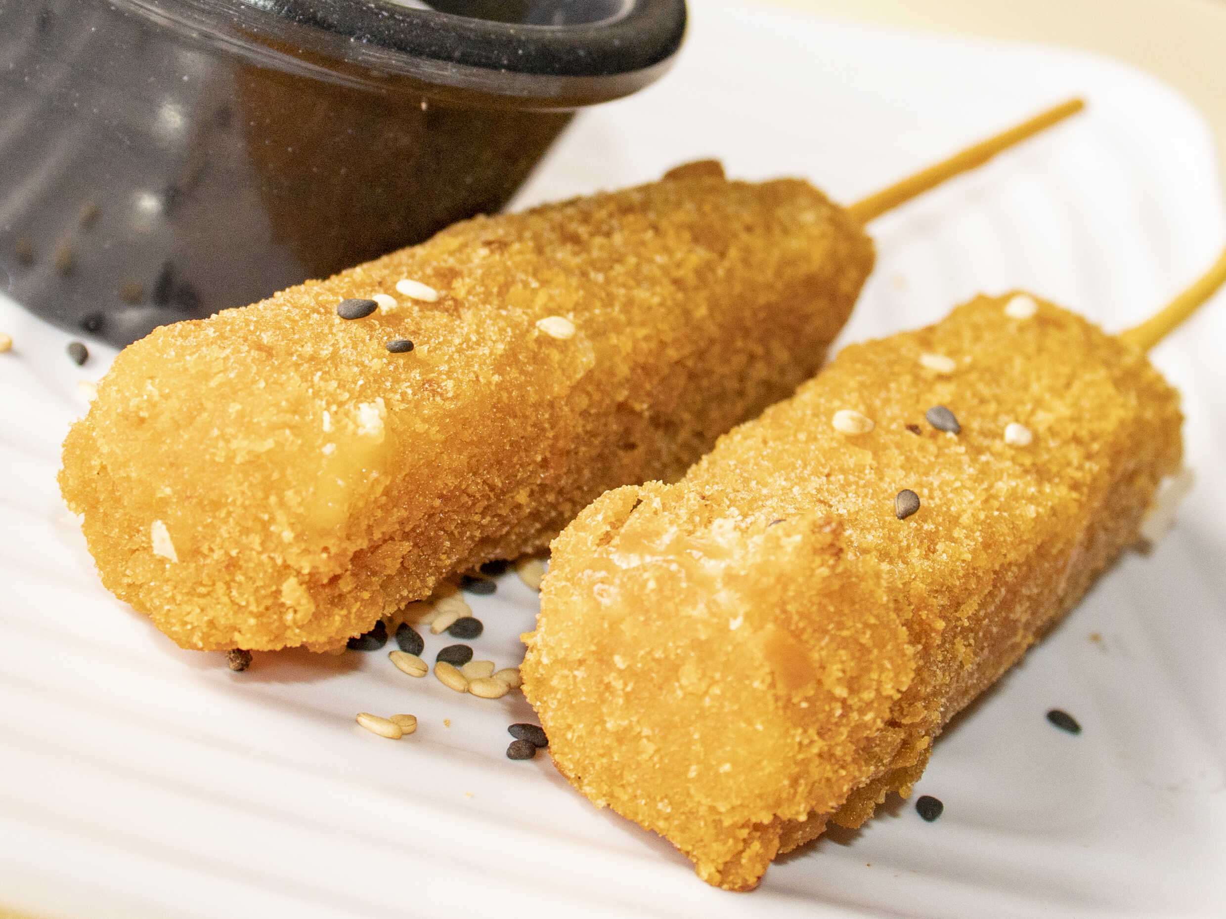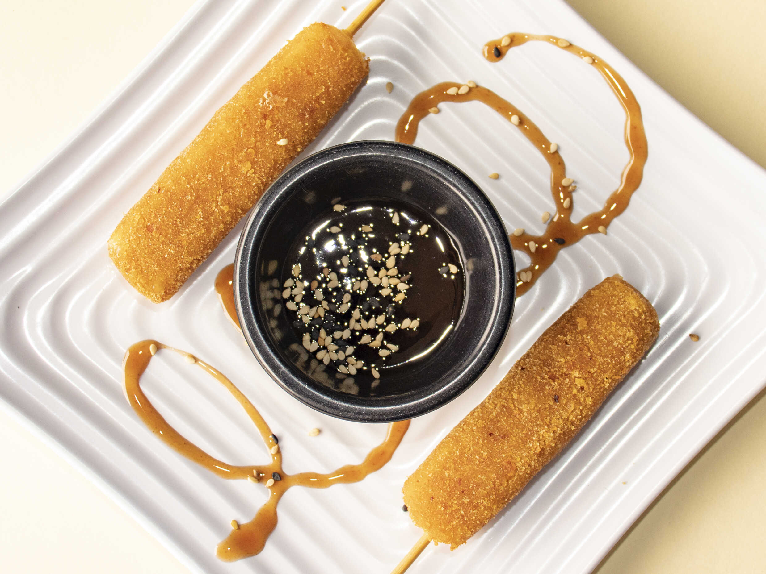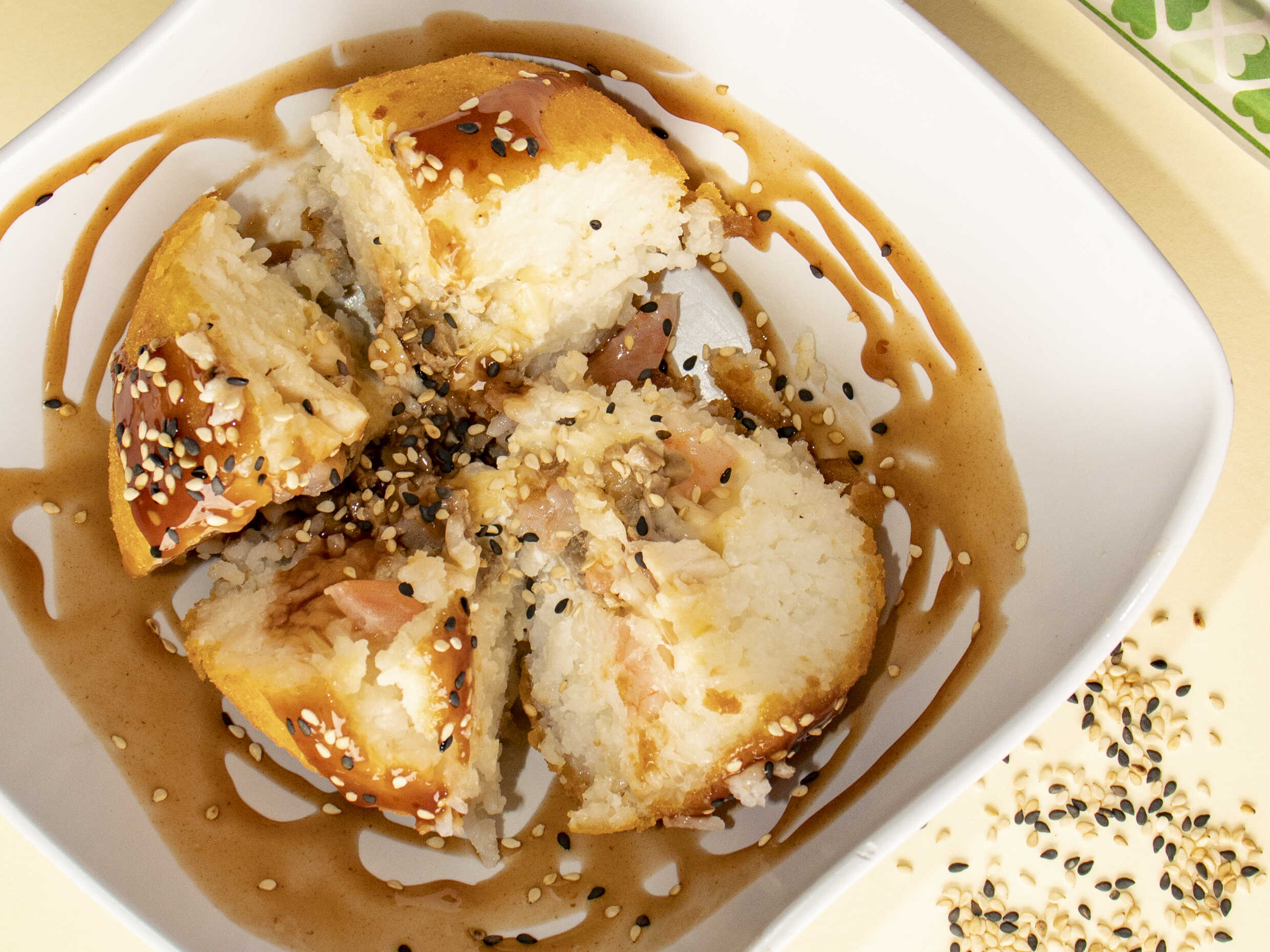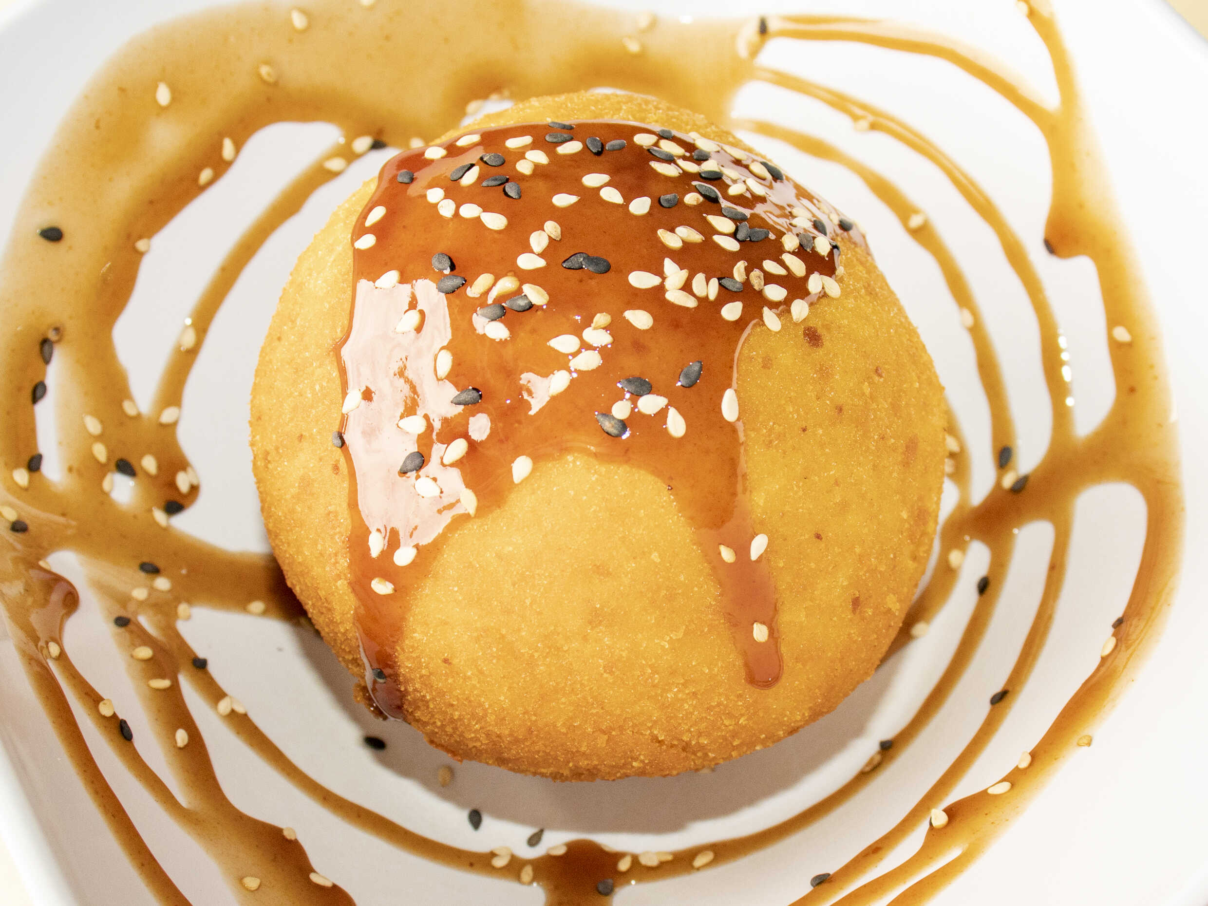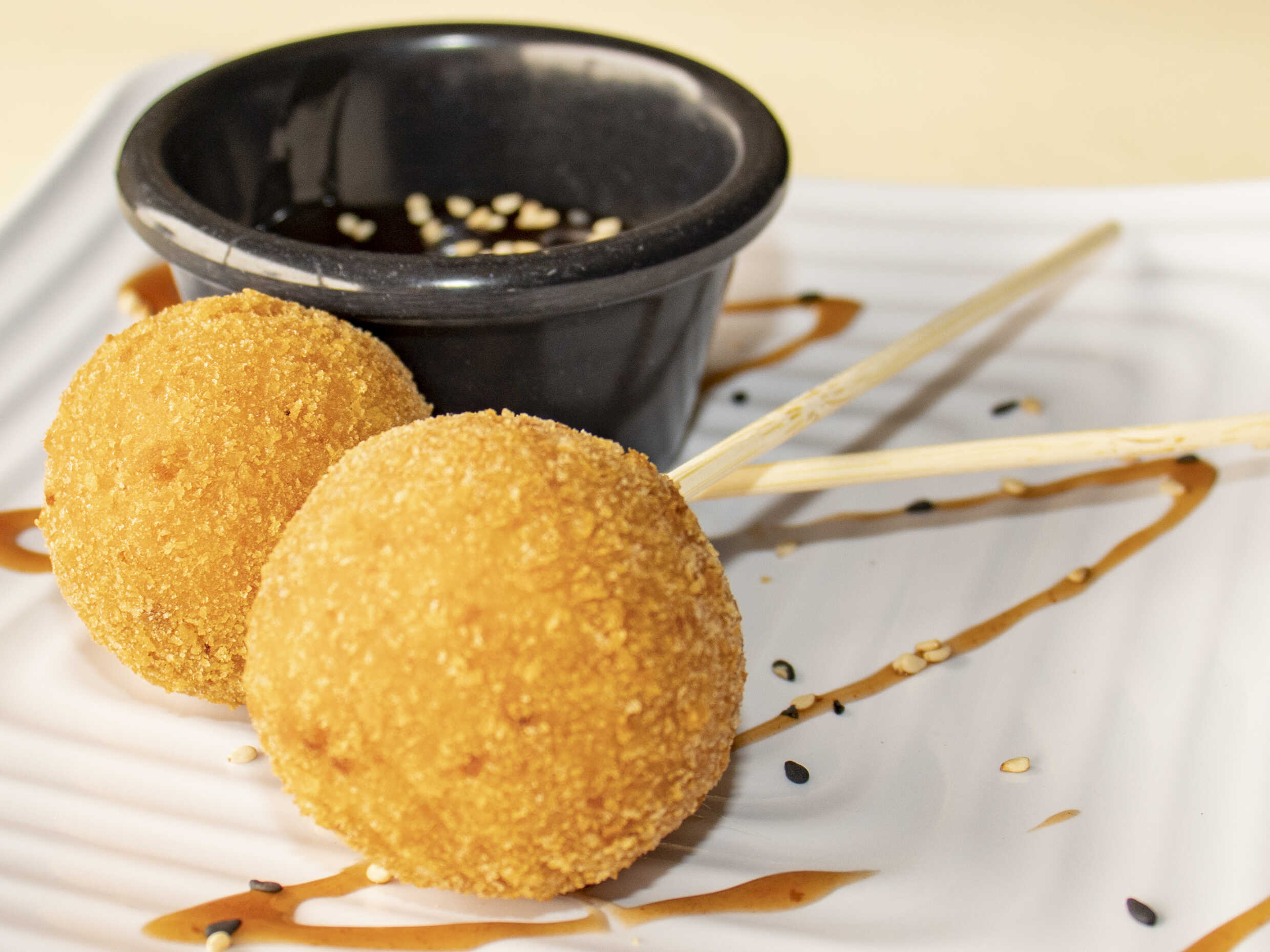 Bola de arroz empanizada rellena de queso philadelphia y manchego.