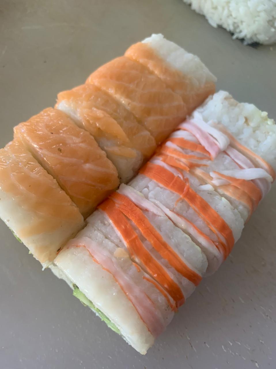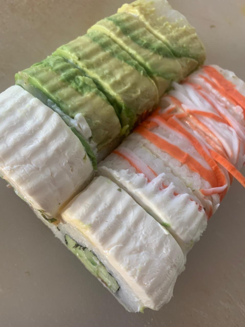Por dentro pepino y aguacate, Por fuera cangrejo, salmón y aderezo mochiro