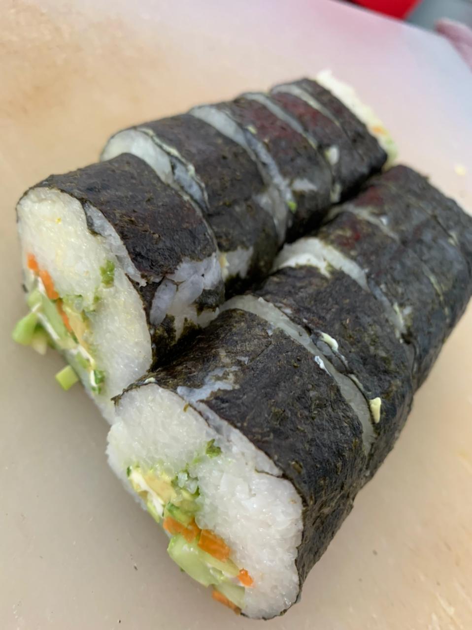 Por dentro Pepino, aguacate, verduras, queso philadelphia, Por fuera Alga, salsa de anguila y ajonjolí