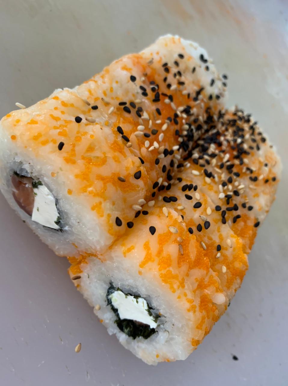 Por dentro salmón y queso, Por fuera Masago y anjonjolí