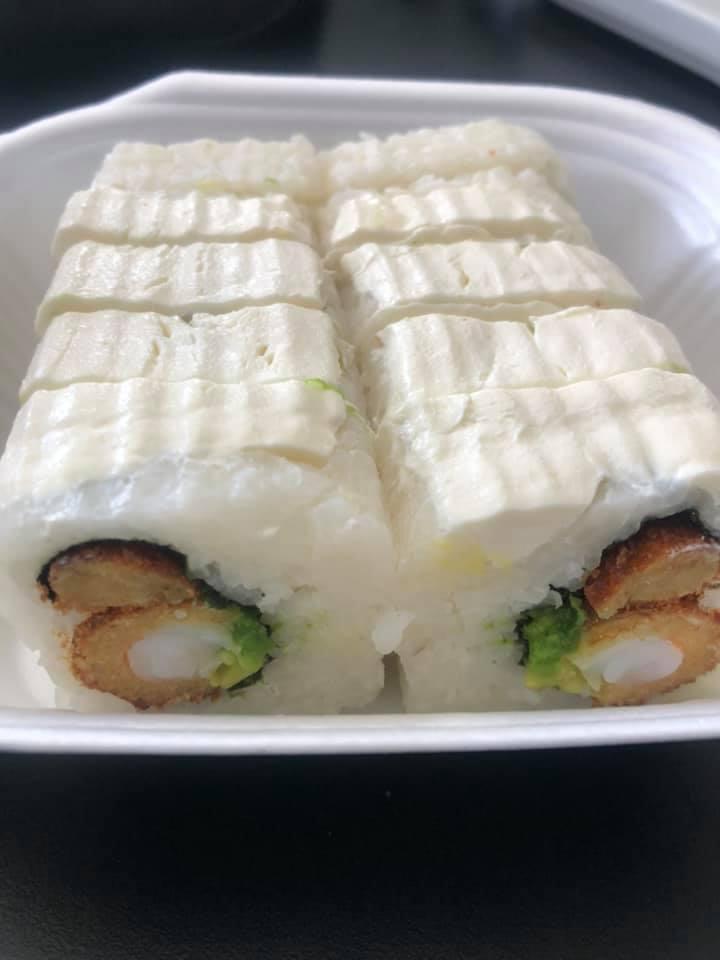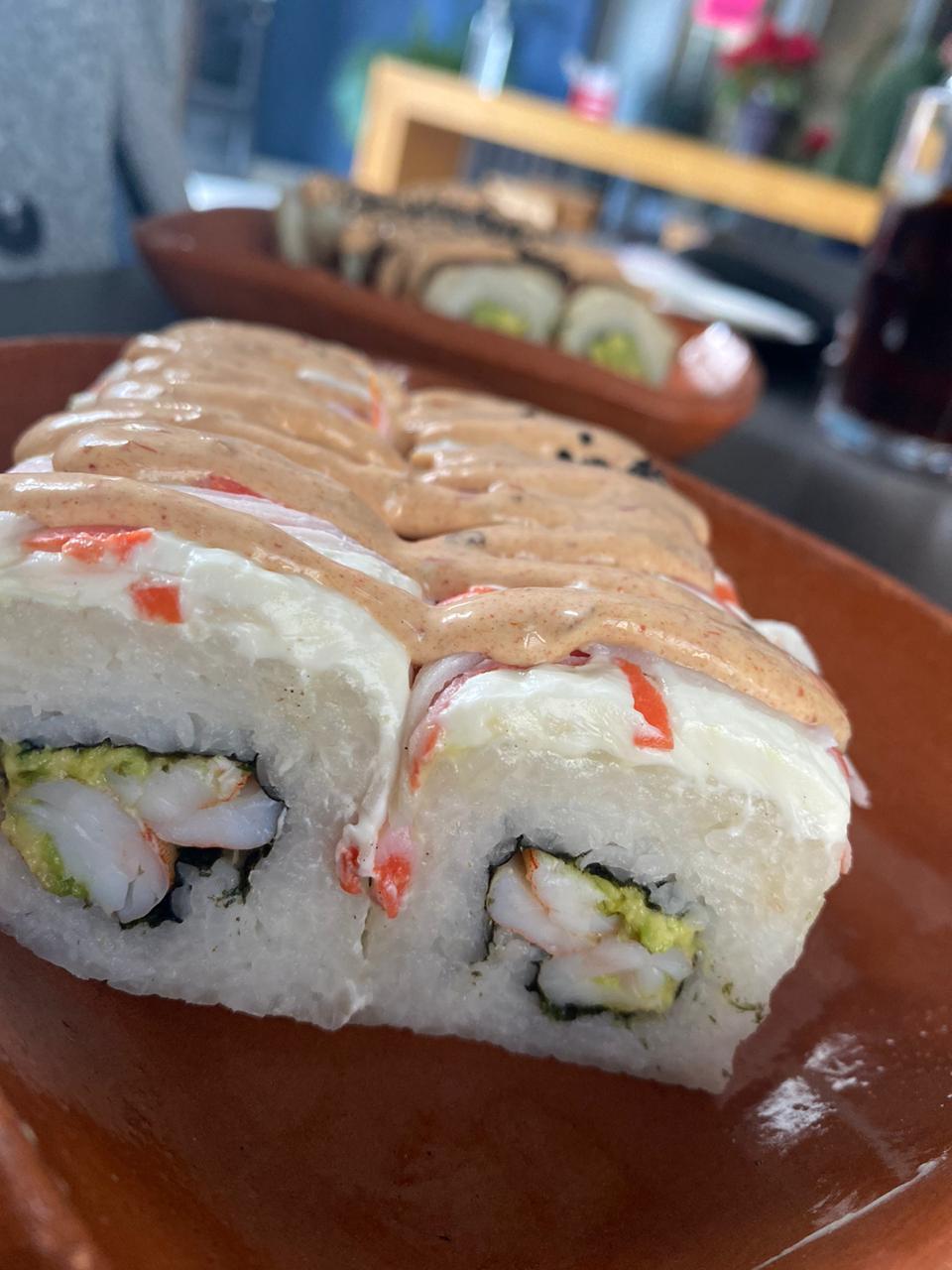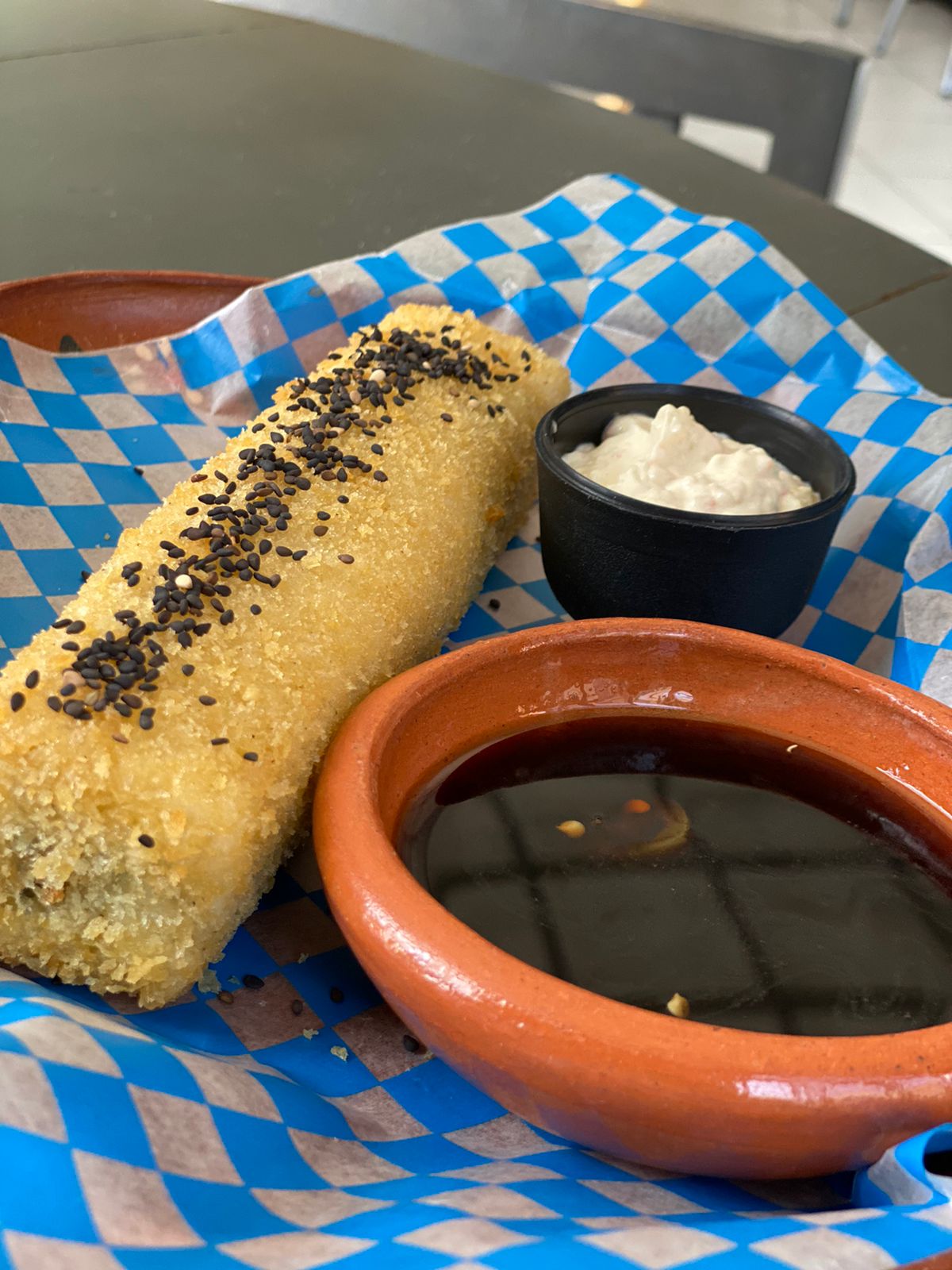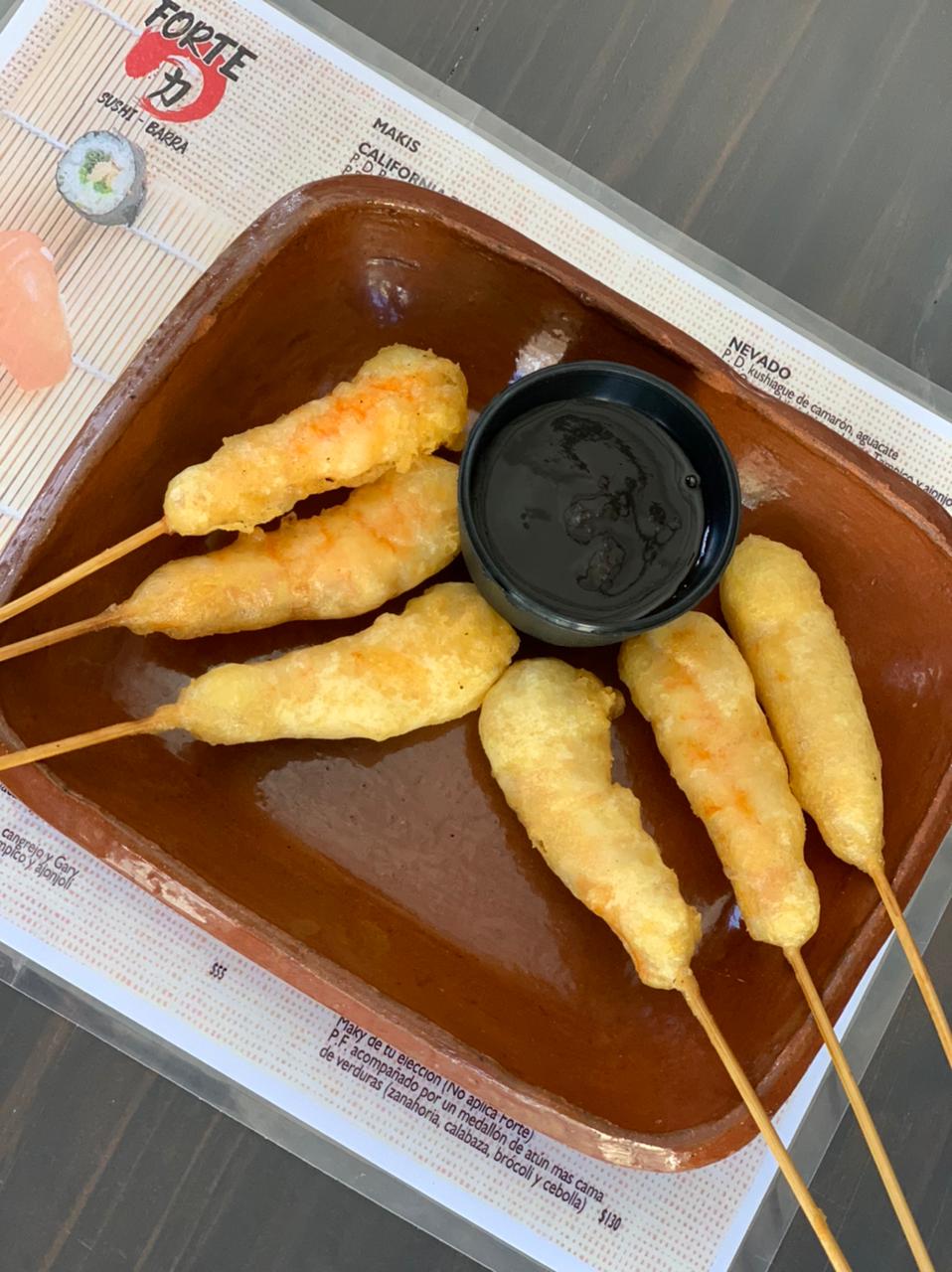 Por dentro Kushiague de camarón, aguacate, Por fuera Queso philadelphia, aderezo Tampico y ajonjolí