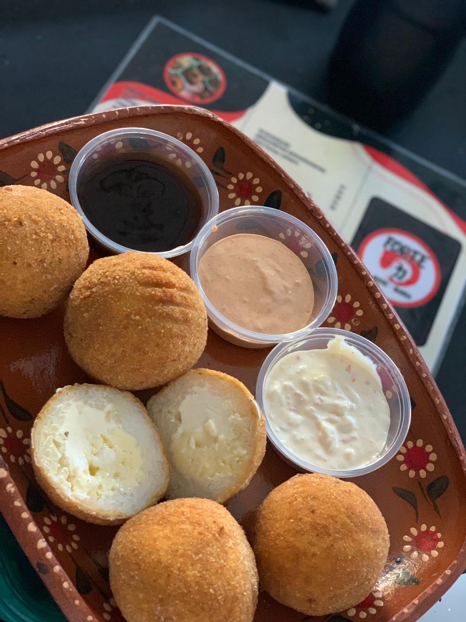 Bola de arroz, con una mezcla de queso Philadelphia y manchego y empanizada y encima aderezo Tampico y ajonjolí.