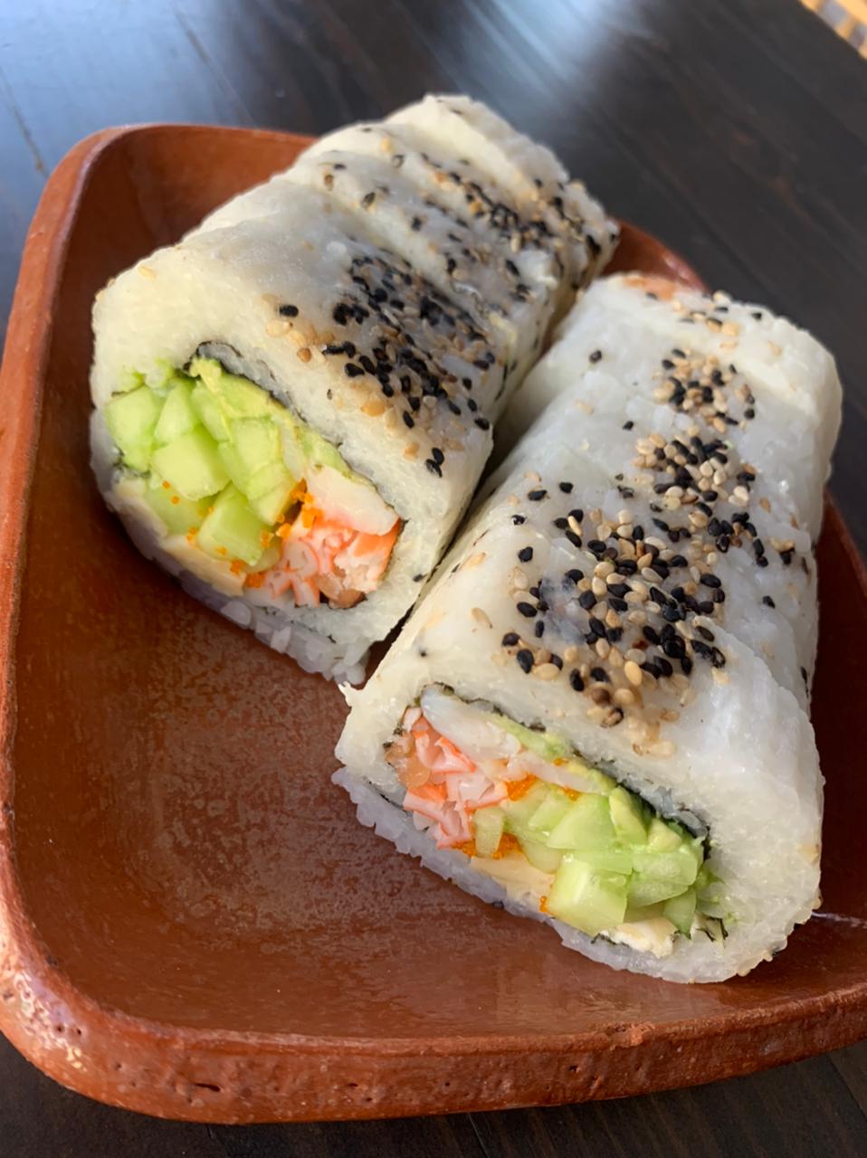 Por dentro pepino, aguacate y camarón Por fuera Masago y Ajonjolí